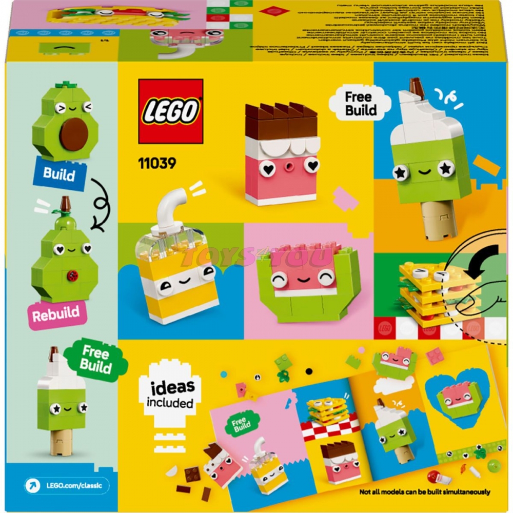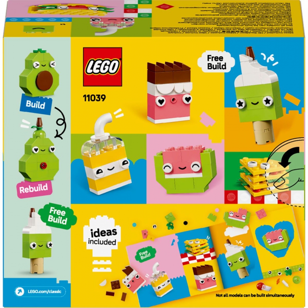 Všestranná stavebnice LEGO® Classic (11039) Kreativní jídlo je ideální pro děti od 4 let. S touto nápaditou hračkou si děti postaví řadu zábavných postaviček z jídla a užijí si celé hodiny hraní. Díky nekonečným možnostem zábavného stavění, přestavování a objevování tato stavebnice LEGO pro začínající stavitele pomáhá rozvíjet sebevědomí, soustředění a schopnost řešit problémy.