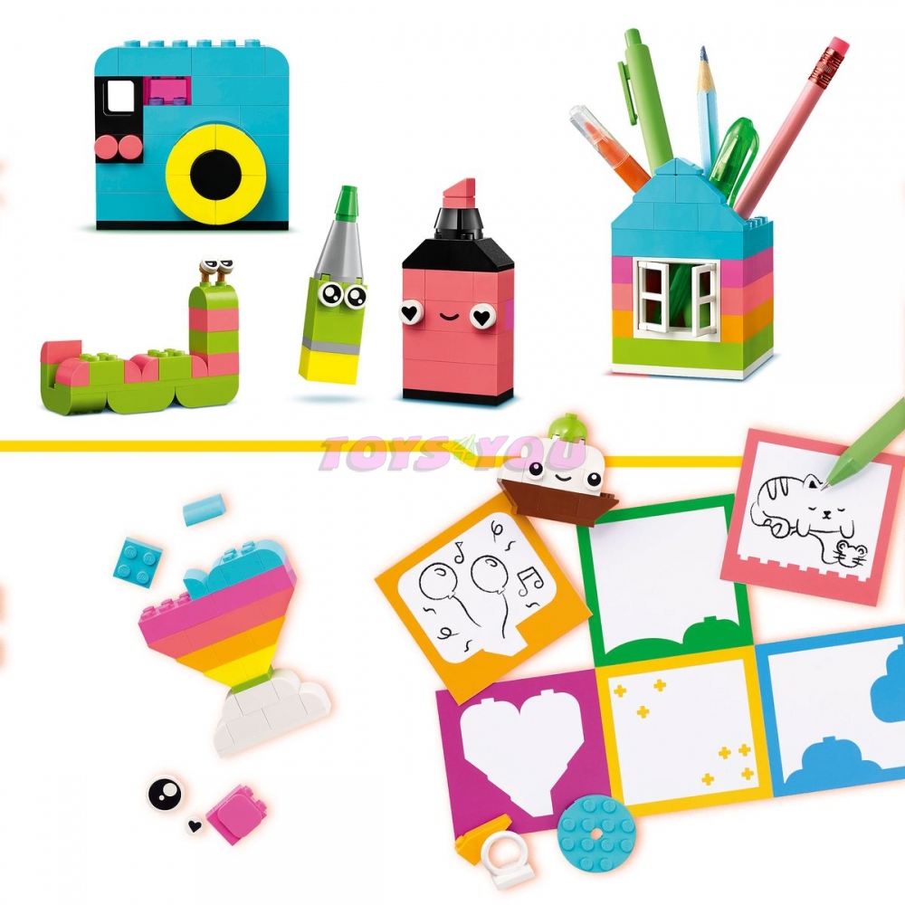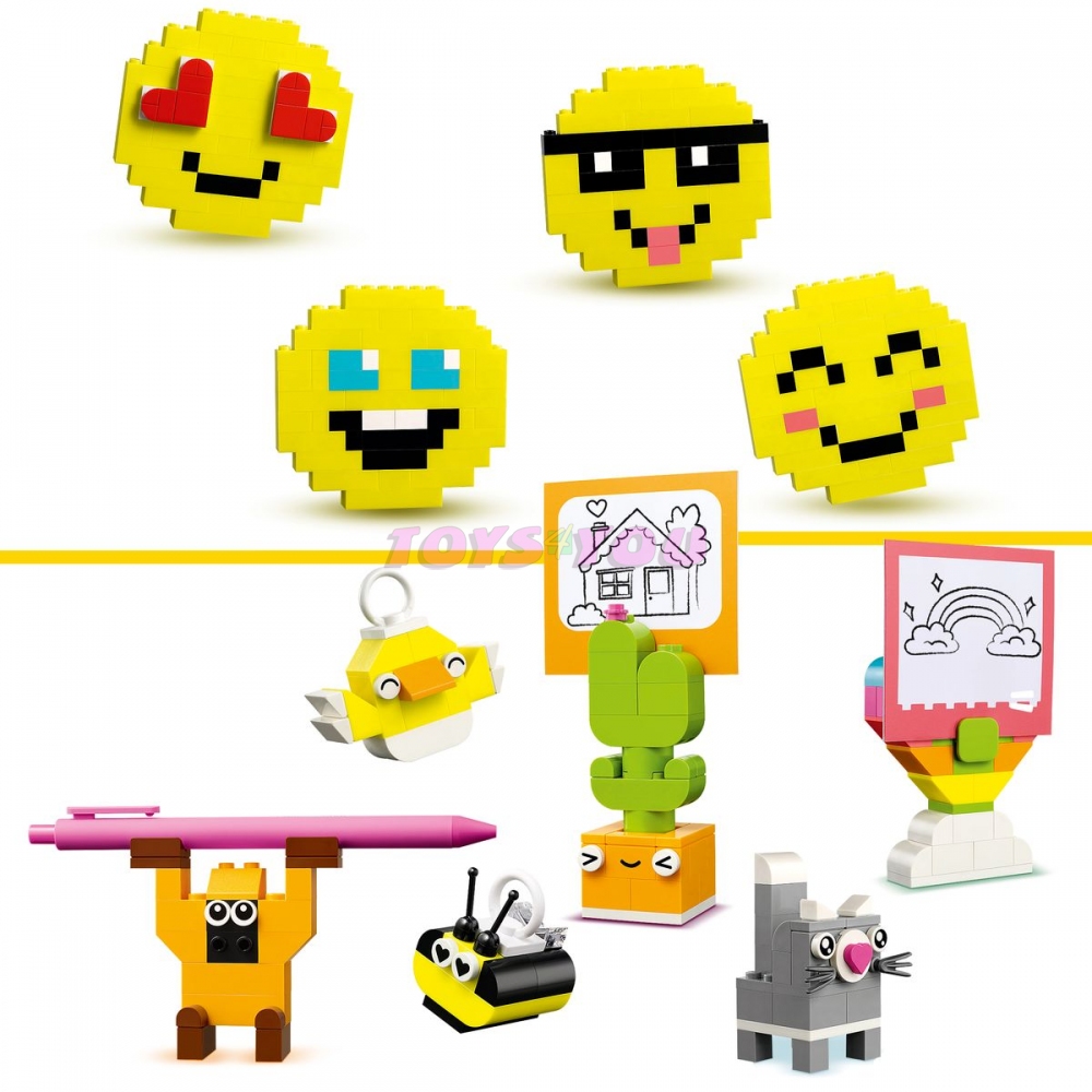 Kreativní veselá krabička obsahuje tipy na 10 rychle sestavitelných modelů, které dětem vykouzlí úsměv na tváři. Malí stavitelé mohou z těchto modelů sestavit 12 nových hraček a poskládat nekonečné množství vlastních zábavných výtvorů, se kterými si vyzdobí pokojíček. Modely pavouka, včely a ptáčka mají závěsné prvky na jednoduché vystavení. Do modelů kraba, opice a domu se vejdou drobnosti, jako je tužka nebo kartáček na zuby. Modely květiny, fotoaparátu, zvýrazňovače, srdce a kaktusu obsahují klipy, ke kterým můžete připevnit vzkaz, přání nebo obrázek (barevný papír je součástí balení). Mezi další modely patří kočka, myš, citron, červ a smajlík. Vneste do svého domova radost s touto zábavnou a praktickou stavebnicí, která inspiruje děti ke kreativitě.