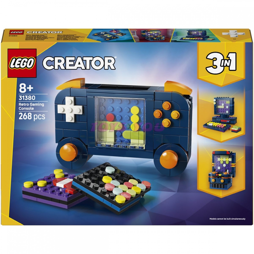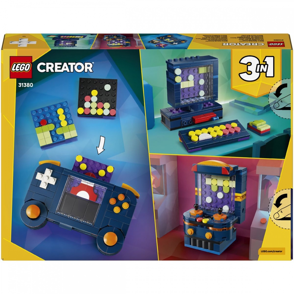 Děti a malí gameři od 8 let si zamilují stavění, hraní a vystavování stavebnice LEGO® Creator 3 v 1 Retro herní konzole (31380). Tato detailně propracovaná a zábavná dekorace do pokojíčku milovníka videoher nabízí 3 různé možnosti stavění ze stejné sady kostek. Kluci a holky si můžou postavit přenosnou herní konzoli se 2 pohyblivými joysticky a 2 pohyblivými tlačítky a 3 herní moduly, které lze vložit do konzole. Tu pak mohou přestavit na stolní mini počítač klávesnicí a monitorem, diskem, který lze vložit dovnitř, a myší, nebo na arkádový herní automat. Tato stavebnice LEGO Creator 3 v 1 podnítí dětskou fantazii a představuje skvělý dárek pro gamery a dospělé, jež naladí na vlnu nostalgie. A díky aplikaci LEGO Builder si děti užijí snadné a intuitivní stavitelské dobrodružství. Své modely můžou přibližovat a otáčet ve 3D, sledovat pokrok ve stavění a ukládat stavebnice na jednom místě. Upozornění: Modely nelze sestavit najednou. Stavebnice obsahuje 268 dílků.