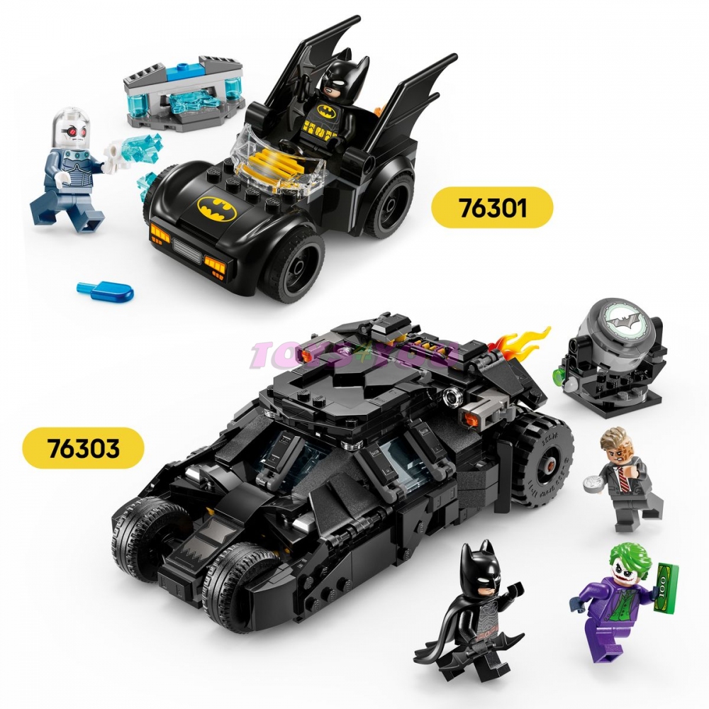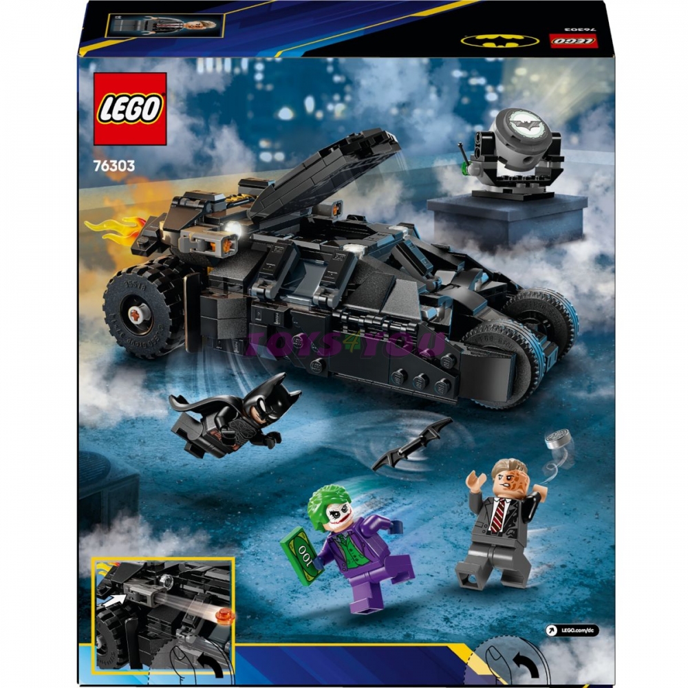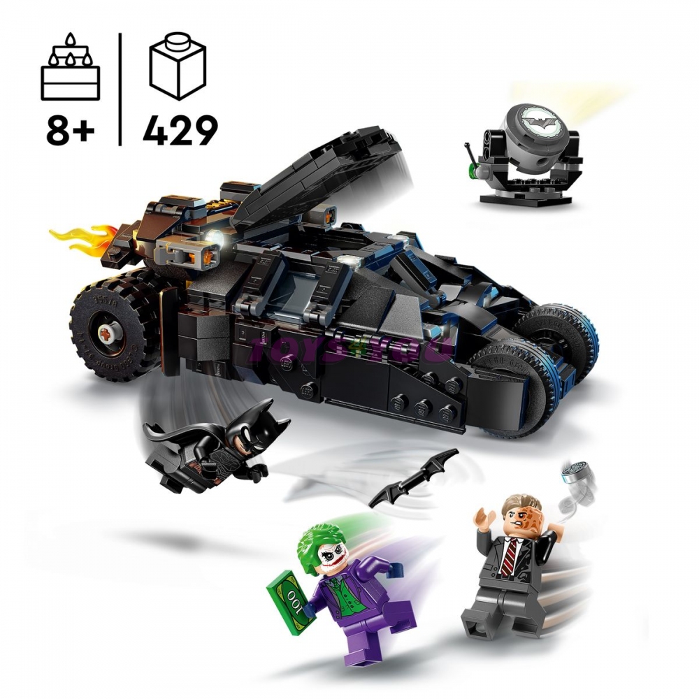 Tato superhrdinská stavebnice LEGO obsahuje 3 minifigurky oblíbených postav: Batmana vyzbrojeného Batarangem, Jokera s balíkem peněz a Two-Face s typickou stříbrnou mincí. Sestavitelný Tumbler Batmobil lze otevřít a odhalit přístrojovou desku a kokpit s prostorem pro Batmana. Z koncovky výfuku vozidla vyčnívá odnímatelný prvek plamene. Projektor Bat-Signalu (nesvítí) lze naklánět a otáčet o 360 stupňů v obou směrech. Pro ještě větší digitální zábavu stavitelé můžou přibližovat a otáčet modely ve 3D a sledovat svůj pokrok pomocí zábavné a intuitivní aplikace LEGO Builder.