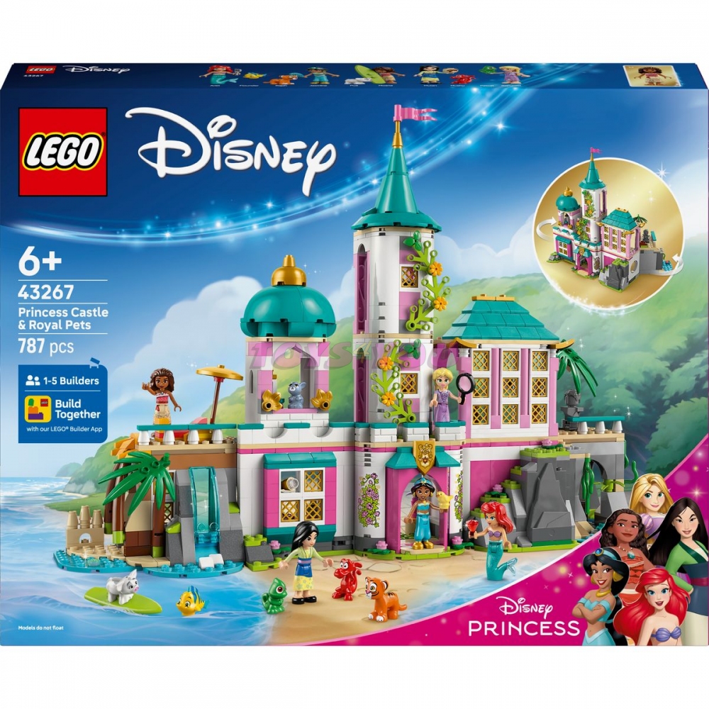 Děti a fanoušci studia Disney objeví kouzelný svět se stavebnicí LEGO® | Disney (43267) Hrad princezen a královští domácí mazlíčci. Tento hrad pro kluky a holky od 6 let obsahuje pokoj pro každou princeznu a poslouží jako krásný dárek. Hrad můžetevystavit zavřený a najdete v něm spoustu doplňků a funkcí, včetně luku, tunelu s vodopádem, odnímatelného nábytku a spoustu dalších. Stavebnice obsahuje 5 minipanenek LEGO | Disney: Ariel, Lociku, Mulan, Jasmínu a Vaianu. Nechybí také 5 zvířecích posta v LEGO | Disney: Šupinka, Pascal, Rádža, Pua a vůbec poprvé také Mushu. Tato stavebnice Disney Princess představuje zábavný dárek pro holky a kluky, které s ní čeká nekonečné hraní. Model můžete zkombinovat s dalšími stavebnicemi LEGO | Disney z této řady (všechny se prodávají samostatně). Díky aplikaci LEGO Builder můžou děti navíc stavět společně s kamarády a rodinou a užít si společný stavitelský zážitek. Stavebnice obsahuje 787 dílků.