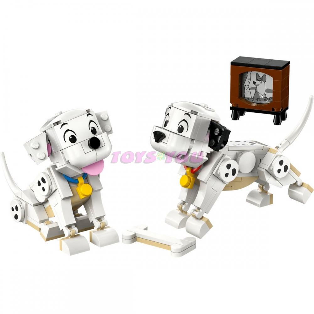 • Dalmatinci všude kolem – Tato stavebnice pro děti obsahuje postavy Štístka a Penny LEGO® | Disney z klasického filmu 101 dalmatinů a navíc kost z kostek a malou televizi s obrazovkou