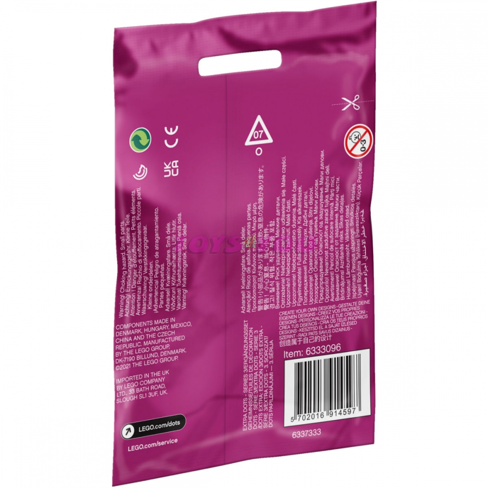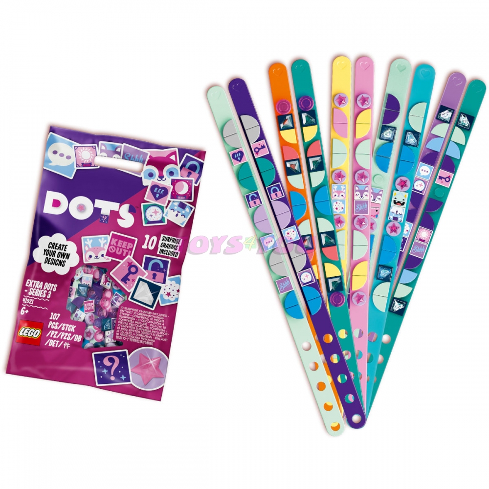 Děti a fanoušci umění a ručních prací si zamilují tajemnou sadu DOTS doplňky – 3. série (41921)! Dílky lze kombinovat také s ostatními stavebnicemi řady LEGO® DOTS. Kromě toho dětem umožňují rozšířit jejich designy a měnit je tak, aby jim ladily s oblečením, náladou a výzdobou pokoje. Sáček obsahuje 107 barevných dílků, včetně těch s 3D efektem s motivy hvězdiček a diamantů, a k tomu navíc 10 speciálních supertajných dílků, které zaujmou deseti z šestnácti možných designů. Děti si tak mohou vyzdobit vlastní náramky nebo předměty v pokoji podle svého vkusu a rozvinout tvůrčí schopnosti. Počet kostek: 107. Věk: 6+