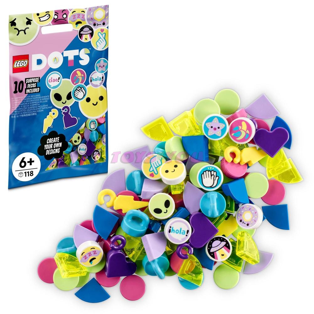 Děti udávající trendy a milovníci ručních prací si 6. sérii DOTS doplňků (41946) doslova zamilují! Lze je nakombinovat se všemi ostatními sadami LEGO® DOTS tak, aby tyto extra dílky dětem umožnily vytvářet přizpůsobitelné návrhy, které budou vždy ladit s jejich oblečením, náladou či pokojem. V tomto sáčku najdete 118 barevných dílků, včetně neonových průsvitných dílků a ozdob ve tvaru srdíček a blesků, a k tomu navíc 10 speciálních grafických dílků z celkem 16 možných vzorů. Děti si tak mohou ozdobit své náramky nebo upravit dekoraci pokoje zcela k obrazu svému a rozvíjet přitom kreativní dovednosti. Počet kostek: 118. Věk: 6+