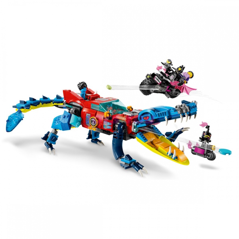Děti od 8 let se s touto sadou LEGO® DREAMZzz™ (71458) Krokodýlí auto vydají do Světa snů. V duchu televizního seriálu tu děti vytvoří parádní auto, které pomůže zachránit Jaydena před děsivým Nočním lovcem. 1 stavebnice, 2 varianty ke stavění Herní stavebnice obsahuje 2 varianty ke stavění a mnoho návodů vedených příběhem, které dětem dávají možnost zvolit si své dobrodružství a užít si dvojnásobnou dobu hraní. Mají na výběr mezi sestavením krokodýlího auta k boji proti nočním můrám a super rychlým terénním autem a mini loďkou k jejich pronásledování. V krokodýlí verzi má auto pohyblivé ruce a nohy a v přední mřížce je ukrytý vystřelovač disků, kterým děti vystřelují disky z krokodýlí tlamy. Terénní auto má otáčecí kola a sundávací střechu, abyste dovnitř mohli posadit minifigurku. Fantastické minifigurky Stavebnice obsahuje propracované minifigurky Coopera a Jaydena a navíc Nočního lovce, který je vybavený parádní motorkou a zlým pomocníkem.