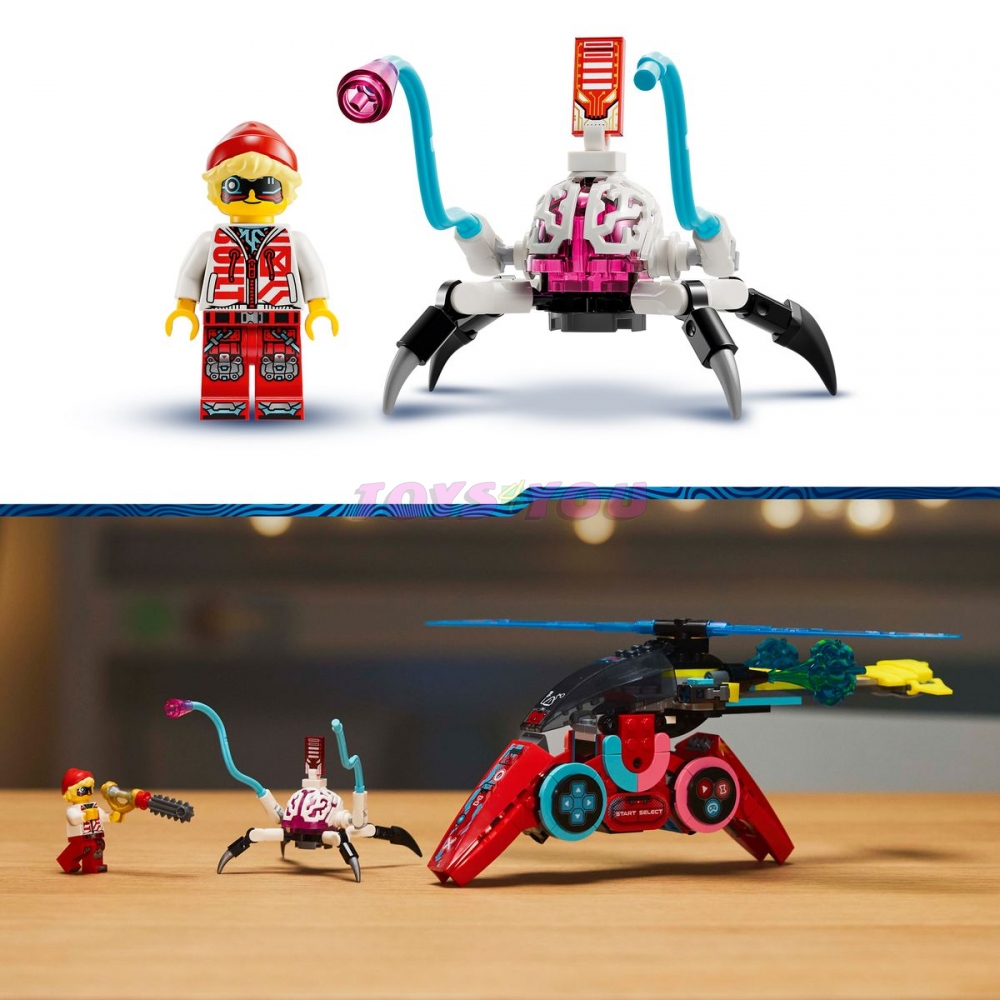Malí snílci si užijí velkou porci zábavy při stavění základního modelu videoherního ovladače, který pak přestaví na herní spídr, což je létající tryskáč inspirovaný videohrami, nebo herní helikoptéru inspirovanou videohrami. Obě varianty mají 2 vystřelovače a otevírací kokpit s dostatkem místa pro minifigurku. Cooper se zbraní dodává stavebnici nádech akce a figurka Kybermozkového pavouka má 2 kabely na vybíjení Cooperových vozidel.