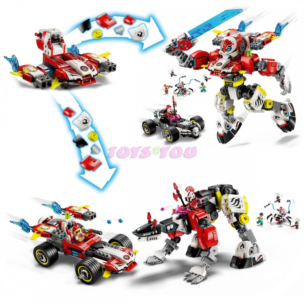 Stavebnice přináší hned 2 strhující možnosti stavění a děti si užijí spoustu zábavy při stavění červeného herního letadla, které pak přestaví na tygřího robota a hot rod nebo na rychlé závodní auto a robota. Tygří robot a robotické stvoření se dokážou hýbat a oba režimy stavění se pyšní řadou skvělých funkcí. Součástí stavebnice závodního auta je také minifigurka Coopera, Zera a snílka, Z-Flek, Kybermozkový pavouk a 2 Kybervěci, které vdechnou život akci a podnítí nápadité hraní.