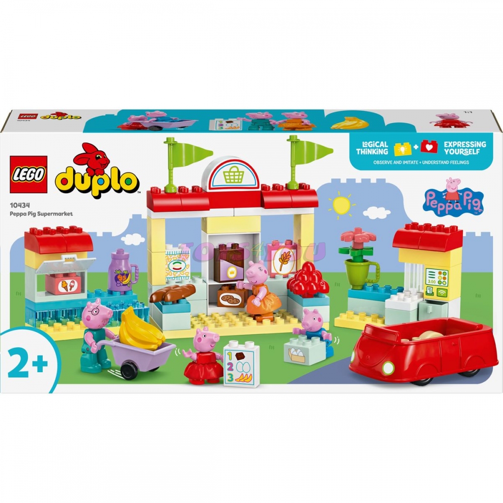 Pomozte dětem od 2 let zahrát si na výlet do obchodu s potravinami se stavebnicí LEGO® DUPLO® (10434) Prasátko Peppa a supermarket. Děti se stanou součástí rodiny a vydají se na nákup potravin v ikonickém červeném autě ze seriálu.
