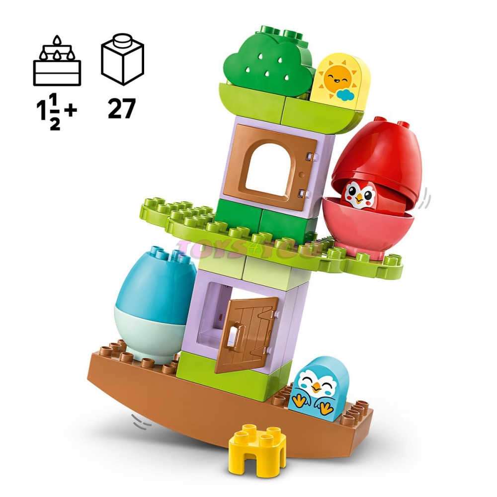 Tato stavebnice pro malé děti je navržena tak, aby pomáhala rozvíjet trpělivost a schopnost řešení problémů při vymýšlení způsobů, jak skládat dílky tak, aby byl strom vyvážený. Malí milovníci zvířat mohou přidat další kostky a strom upevnit nebo jednoduše prozkoumávat domek na stromě se sovími figurkami LEGO® DUPLO®.