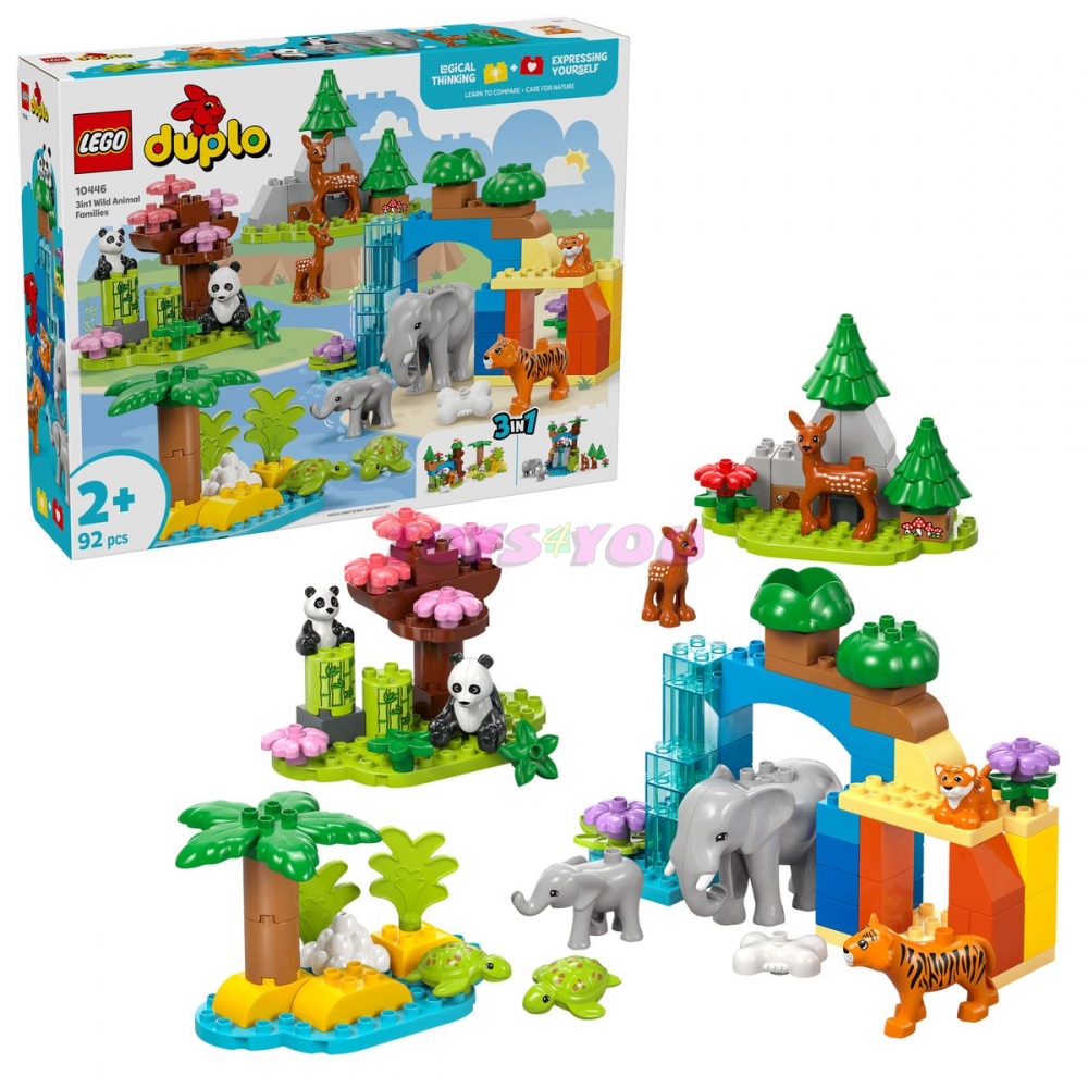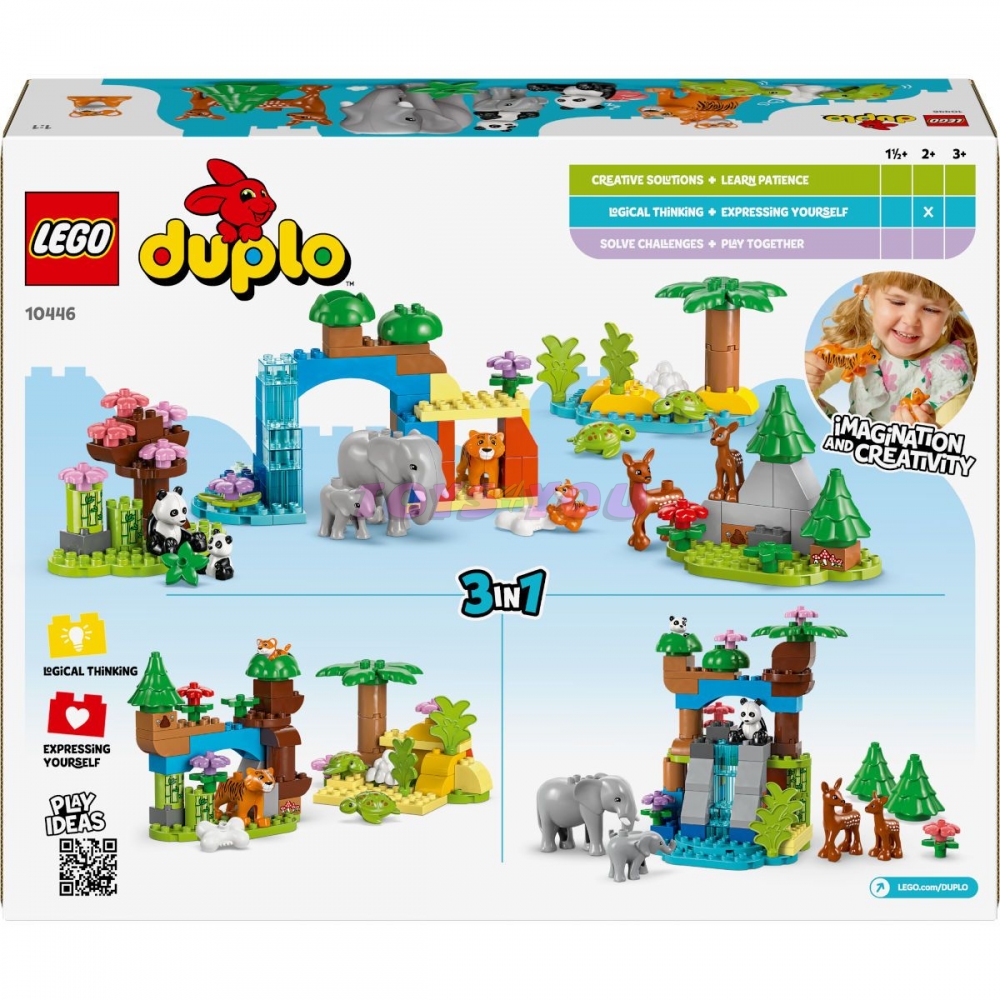 Malí milovníci hraček s motivem přírody si s touto stavebnicí procvičí celou řadu dovedností:Spárují a porovnají dospělá zvířata a jejich mláďata a rozhodnou o tom, jaké jídlo jednotlivá zvířátka jedí. Při přestavování této stavebnice LEGO DUPLO 3 v 1 pak zapojí kreativitu a představivost.