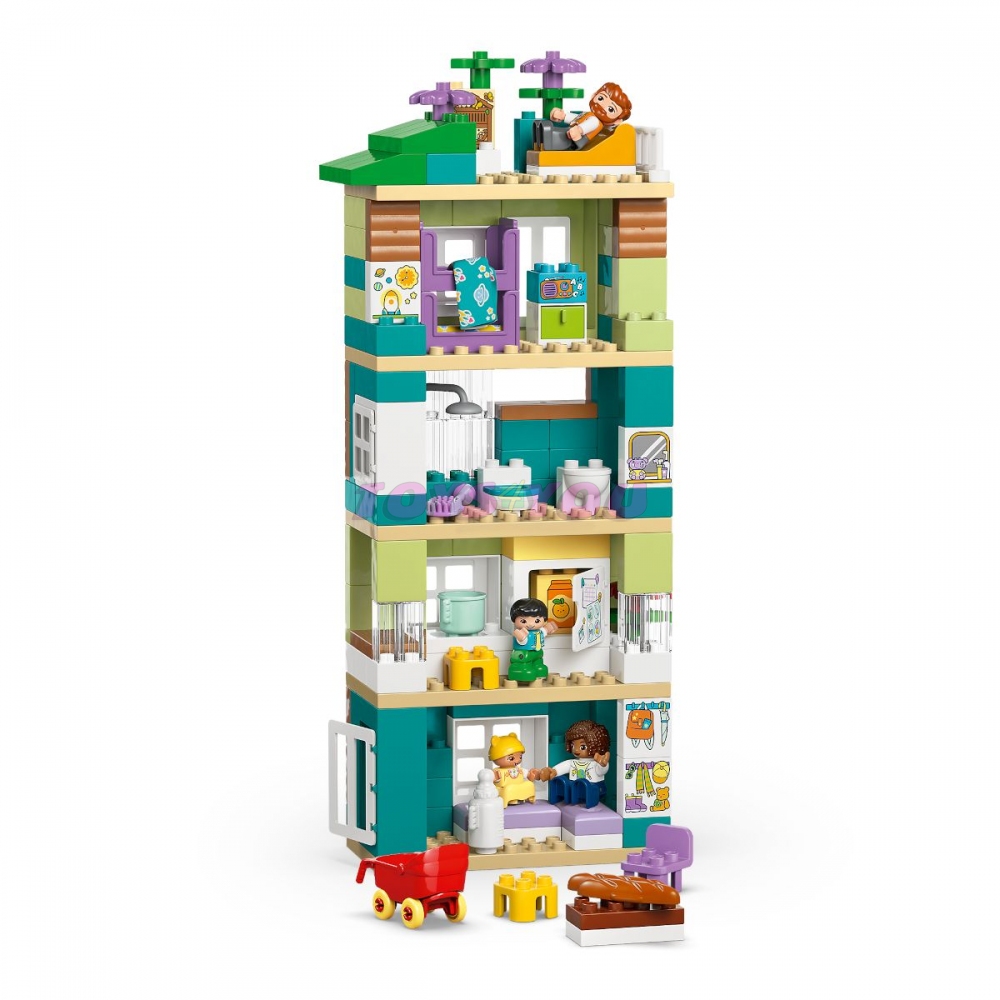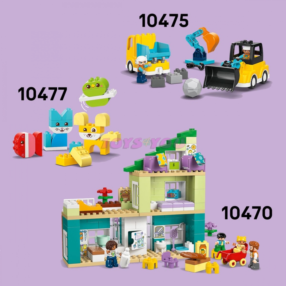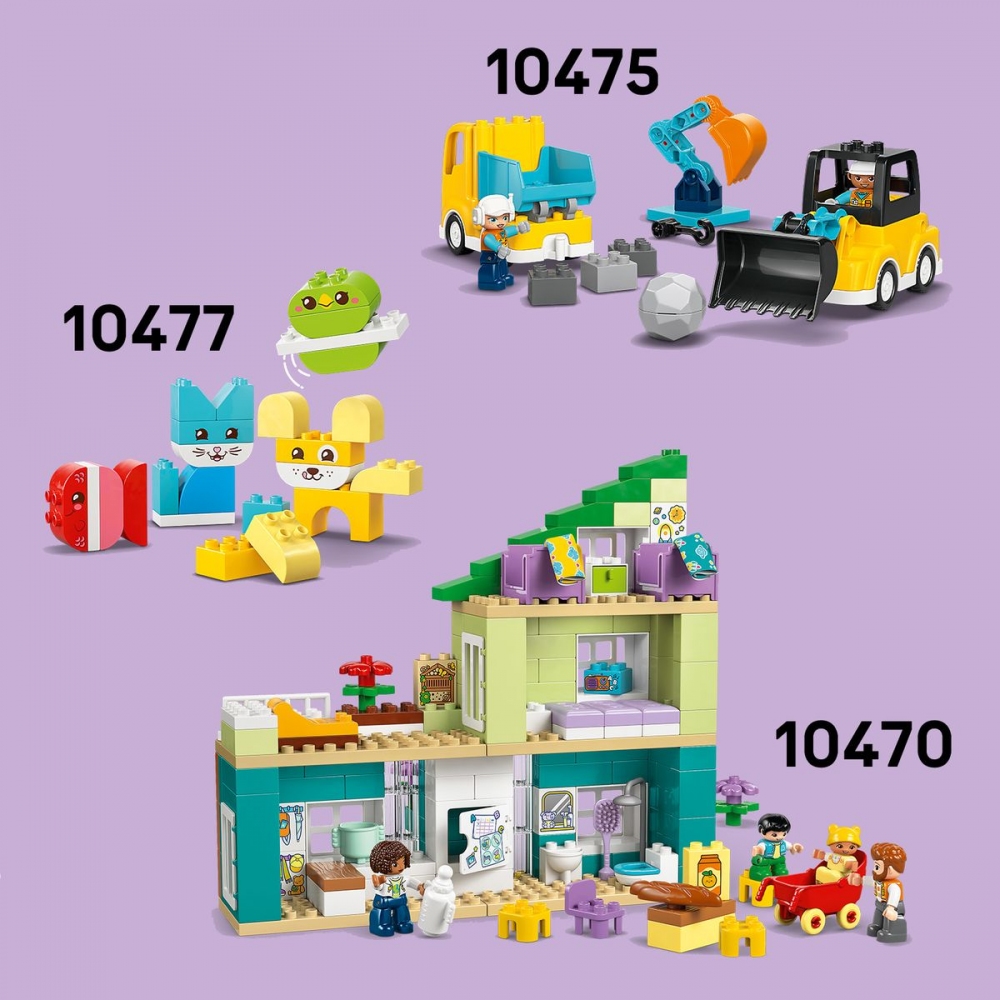 Batolata od 2 let si užijí kreativní hraní na scény z rodinného života díky stavebnici Moderní rodinný dům 3 v 1 s figurkami (10470). Součástí této interaktivní hračky rodinného domku jsou 4 figurky – 2 rodiče, batole a miminko –, díky kterým dětipři hraní na rodinku rozvinou své sociální a emoční dovednosti. Malé děti si ze stejné sady kostek LEGO® DUPLO® můžou postavit hned 3 různé kreativní modely a procvičí při tom své jemné motorické dovednosti. Můžou postavit jednopatrový byt, třípatrový nebo pětipatrový domek pro panenky se střešní zahradou a doplňky, jako je lehátko a hmyzí hotel. Tato hračka pro malé děti obsahuje spoustu doplňků, které děti znají ze svých domovů, jako je lednička, záchod a kočárek. Tyto prvky inspirují děti k hodinám živé hry na příběhy, při nichž budou rozvíjet kreativitu, učit se o běžném každodenním fungování domácnosti a zkoumat role a úlohy jednotlivých členů rodiny. Stavebnice obsahuje 166 dílků.
