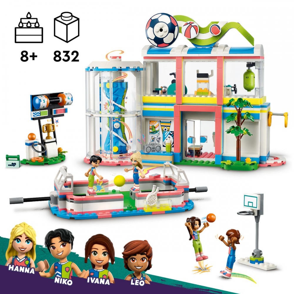 LEGO® Friends 41744 Sportovní středisko. "Udělejte dětem se zájmem o sport od 8 let radost stavebnicí LEGO® Friends Sportovní středisko (41744) . Součástí jsou 4 minipanenky a spousta doplňků. Nechybí hřiště, které lze přizpůsobit různým sportům výměnou branek a sítí. Ve stavebnici také najdete držáky na minipanenky a několik druhů míčů, takže postavy mohou za pomoci dětí skutečně hrát. Po fotbalovém tréninku branky vyměňte za tenisovou síť a střílejte přes ni míčky. Pak síť vyměňte za basketbalový koš a naučte se skórovat. Stavebnice obsahuje také ukazatel skóre a místo na odkládání míčů. Uvnitř sportovního střediska mohou děti prozkoumat posilovnu, lezeckou stěnu a šatnu.