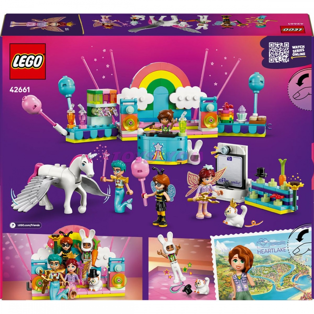Stavebnice LEGO® Friends (42661) Kostýmová párty s jednorožcem a vílou pro holky a kluky od 6 let obsahuje 4 minipanenky LEGO Friends, figurku kočky a figurku koně a nechybí spousta roztomilých párty doplňků, které inspirují k zábavnému hraní. Děti si vymyslí vlastní zábavné příběhy a zahrají si na společenské situace s kamarády, kteří si zkoušejí kostýmy. Autumn je převlečená za čmeláka a Olly má kostým mořského muže. Připojí se k nim i kocour Churro v kostýmu kouzelníka a Leo v kostýmu králíčka. Paisley má na sobě kostým víly a kůň Periwinkle se promění v jednorožce. Kamarádi si užijí párty s pódiem, djským koutkem a občerstvením. Nechybí fotokoutek se zábavnými doplňky, kde kamarádi nafotí zábavné fotky! Objevte další skvělé hračky a dárky ze světa LEGO Friends (prodávají se samostatně). Tato stavebnice je kompatibilní s aplikací LEGO Builder, která přináší intuitivní stavitelské dobrodružství. V ní můžou děti přibližovat a otáčet modely a sledovat svůj postup při stavění.