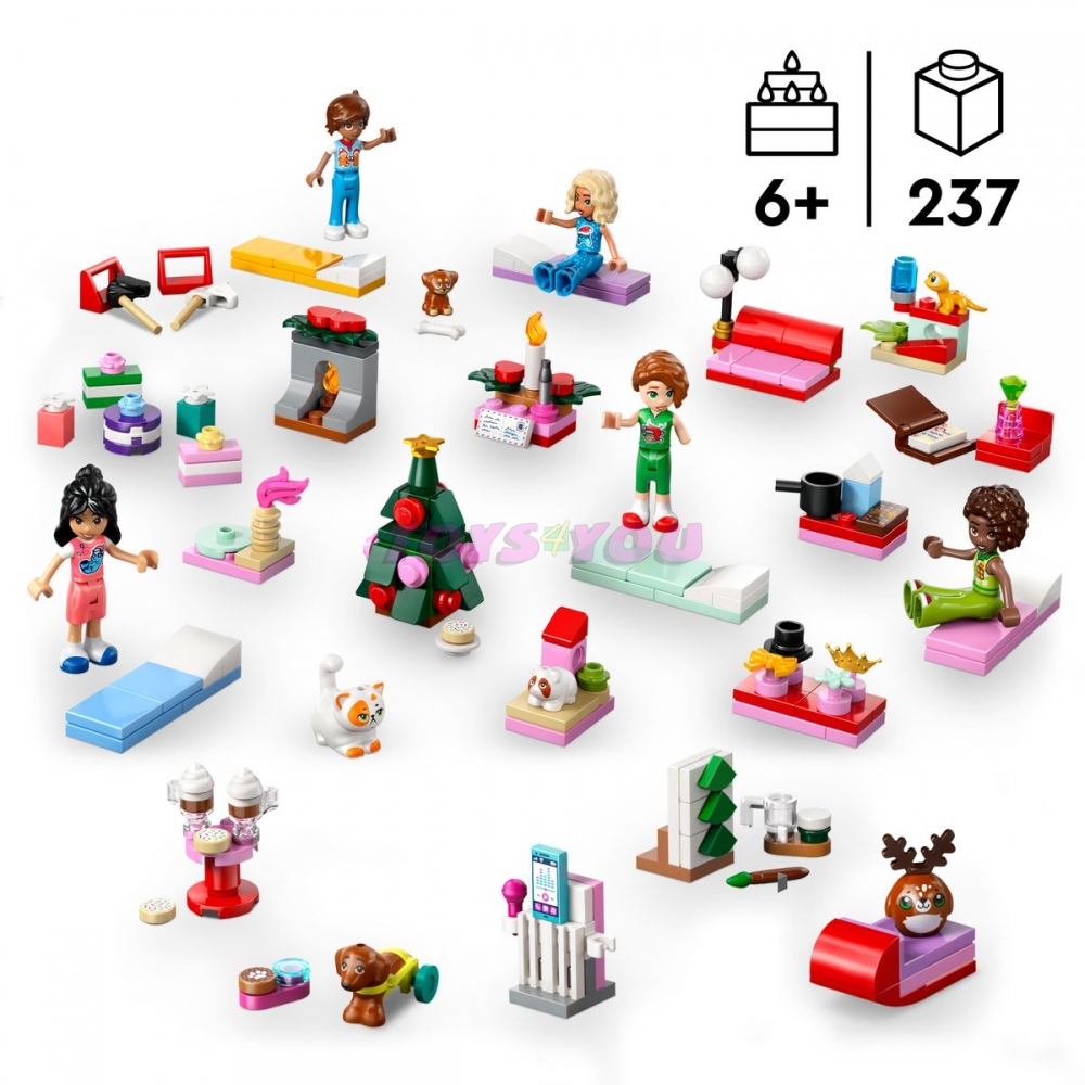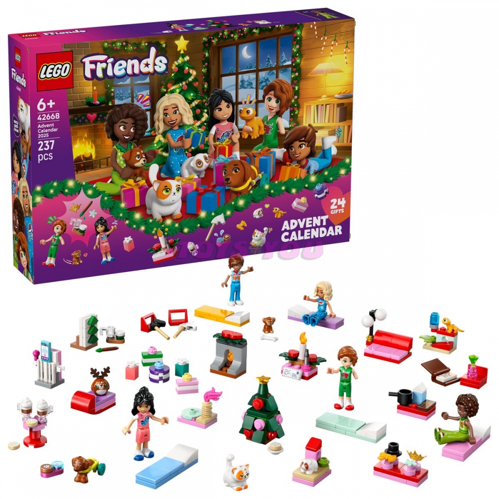 Vneste si domů sváteční atmosféru se stavebnicí LEGO® Friends (42668) Adventní kalendář 2025 pro děti od 6 let. Malí stavitelé každý den otevřou jedno okénko, za kterým najdou celkem 5 minipanenek včetně Aliyi, Autumn, Liann, Novy a Lea a 5 figurek zvířátek LEGO včetně 2 psů, morčete, gekona a kočky. Každý den vás za jedním okénkem čeká kousek příběhu o vánoční přespávačce. Objevte překvapení se sladkými vánočními modely a sváteční aktivity, jako je psaní dopisu Santovi, zdobení stromečku, zpívání karaoke, jízda na koníčkovi a příprava horké čokolády. Každá minipanenka má matraci a každé zvířátko má doplňky. Děti si tak při sestavování scény vymyslí řadu příběhů. Mezi další zábavné doplňky patří pohovka, lampa, krb, sáňky, 5 dárkových krabiček a plyšový sob LEGO. Tato kreativní stavebnice slouží nejen jako dárek k vánočnímu odpočítávání pro děti, ale také podporuje sociální dovednosti malých stavitelů, kteří se připojí k kamarádům a společně s nimi prožijí nezapomenutelnou přespávačku. Adventní kalendář LEGO® Friends 2025 – Tato stavebnice s adventním kalendářem pro děti je nabitá 24 překvapeními pro holky a kluky od 6 let, kteří si s ní postaví scénu ze sváteční přespávačky u kamarádů Užijte si řadu vánočních aktivit – Přidejte se k postavám, které píší dopisy Santovi, zdobí stromeček, zpívají karaoke, jezdí na koníčkovi, připravují horkou čokoládu a odpočívají na postelích 5 postav LEGO® Friends – Součástí jsou minipanenky Aliyi, Autumn, Liann, Novy a Lea a nechybí 5 figurek LEGO zvířátek: 2 psi, morče, gekon a kočka Postavte si zábavu – Každá minipanenka má vlastní matraci a každé zvířátko má jeden doplněk: Aira má kost, Popcorn má automat na vodu, Churro má škrabadlo, Ruby má pelíšek a Pickle má stanici s jídlem Adventní kalendář plný příběhů – Tato stavebnice LEGO® Friends představuje milý adventní dárek pro děti, které mají rády období Vánoc Online seriál – Inspirujte malé stavitele k dalším kreativním nápadům se stavebnicemi (prodávají se samostatně) aonline seriálem LEGO® Friends: Nová kapitola, ve kterém se děti seznámí s postavami z městečka Heartlake Vyprávějte příběhy o přátelství – S řadou stavebnic LEGO® Friends (prodávají se samostatně) si děti užijí různé okamžiky přátelství a spoustupříležitostí k vymýšlení nápaditých příběhů Co najdete v krabici? – Stavebnice se skládá z 237 dílků a obsahuje 24 okének s překvapeními – postavy, domácí mazlíčky, aktivity a další věci, které budete objevovat během adventu. Adventní kalendář LEGO® Friends měří 38,2 cm na výšku, 70,5 cm na šířku a 26,2 cm do hloubky. Počet kostek: 237. Věk: 6+