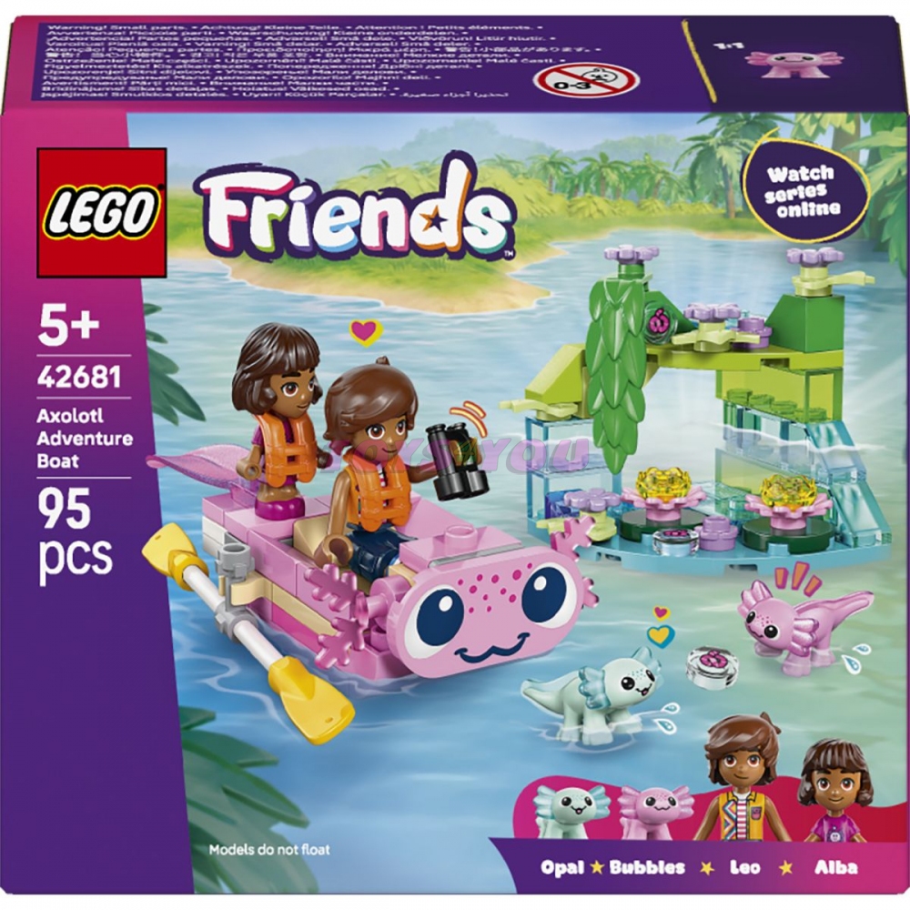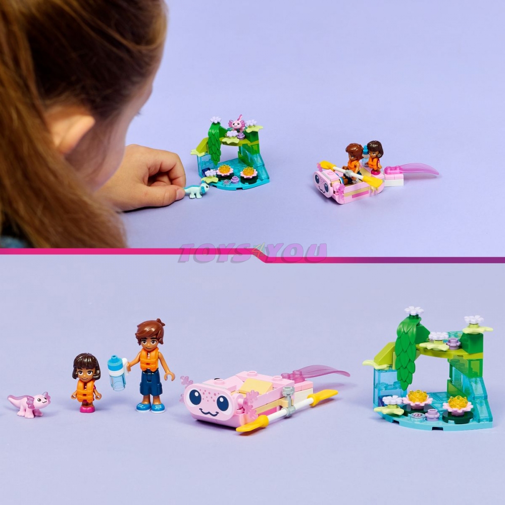 Inspirujte holky a kluky od 5 let k vymýšlení zábavných příběhů se stavebnicí LEGO® Friends Dobrodružný člun s axolotly (42681) pro děti. Stavebnice obsahuje 1 minipanenku, 1 mikropanenku, 2 mini axolotly a doplňky, které podněcují kreativní hraní. Děti si užijí velkou porci zábavy se člunem, který zdobí usmívající se přátelský obličej axolotla a kmitající ocas. Součástí jsou také sedátka pro postavičky, vesla a 2 záchranné vesty. Připojitelný menší model je zdoben rostlinami, květinami a kostkami v podobě vody, aby děti mohly vytvořit přirozené prostředí pro axolotly. Tato stavebnice na hraní příběhů představuje skvělý dárek pro holky, kluky a všechny milovníky zvířat. S aplikací LEGO Builder si děti užijí intuitivní stavitelské dobrodružství. Můžou v ní přibližovat a otáčet modely ve 3D, ukládat stavebnice a sledovat postup stavění. Stavebnice obsahuje 95 dílků. STAVEBNICE S AXOLOTLY – Tato dětská stavebnice LEGO® Friends Dobrodružný člun s axolotly (42681) obsahuje mini člun, 2 postavičky a 2 mini axolotly, se kterými si děti od 5 let zaručeně užijí spoustu zábavy ROZKOŠNÁ HRAČKA – Roztomilá loďka s motivem axolotla má kývající se ocas a součástí jsou vesla a 2 záchranné vesty, které děti inspirují k vyprávění příběhů o dobrodružstvích v přírodě 2 POSTAVY LEGO® FRIENDS – Tato stavebnice obsahuje minipanenku Lea, mikrofigurku Alby, 2 figurky axolotlů a doplňky, které děti inspirují ke kreativnímu hraní PŘÍBĚHY SE ZVÍŘÁTKY – S touto hračkou si děti vymyslí zábavné příběhy o přírodě a zvířátkách a pomocí mini lodě prozkoumávají přirozené prostředí axolotlů NÁPAD NA DÁREK – Tato stavebnice LEGO® Friends představuje zábavný dárek pro milovníky zvířat od 5 let, kteří si rádi hrají na fantastické příběhy ONLINE SERIÁL – Užijte si hodiny hraní s dalšími stavebnicemi (prodávají se samostatně) a online seriálem LEGO® Friends: Nová kapitola, ve kterém se děti seznámí s postavami z městečka Heartlake ZÁBAVNÉ STAVĚNÍ – Proveďte děti na jejich příštím stavitelském dobrodružství intuitivní aplikací LEGO® Builder s návodem. Umožní jim ukládat si stavebnice, sledovat postup a přibližovat a otáčet modely ve 3D, zatímco na nich pracují ROZMĚRY – Stavebnice se skládá z 95 dílků a člun LEGO® měří přes 2 cm na výšku, 10 cm na délku a 5 cm na šířku. Kostky: 95. Věk: 5+.