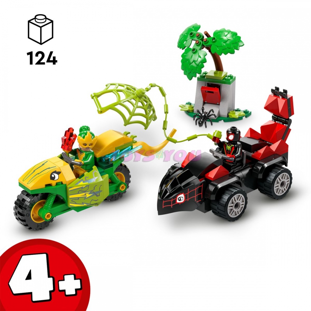 Stavebnice ztvárňuje akční scény ze série „Dino-Webs“ z televizního seriálu Spidey a jeho úžasní přátelé. Obsahuje 2 minifigurky superhrdinů a 2 tahací dinosauří vozidla: Milese „Spin“ Moralese v autě se stegosaurem a Electro na motorce s dilophosaurem. Velká pavučina, krystal ukrytý v kameni a doplňky terénu inspirují děti ke kreativnímu hraní. Uvnitř krabice najdete sáčky, které obsahují kostky a velkou začátečnickou kostku pro rychlé sestavení modelu a postavy, takže děti se můžou hned pustit do hraní. Nechybí intuitivní návod ve podobě barevného obrázkového příběhu.