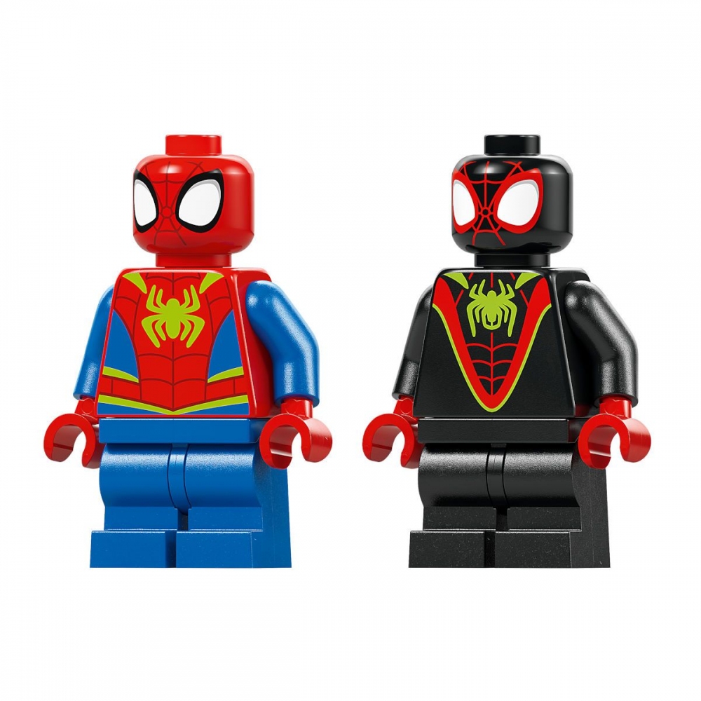 Tato stavebnice LEGO® obsahuje minifigurky Spideyho a Milese „Spin“ Moralese a 2 sestavitelné figurky dinosaurů: Ghost-Spider jako pterodaktyla a Rhina jako triceratopse. Součástí je také Spideyho truck LEGO s velkou pavučinou připevněnou k zadní straně, funkce padajícího kamene ovládaná spouští, dinosauří vejce, které je třeba odhalit, a pavučina, kterou můžete spustit a s její pomocí chytit padoucha do pasti. Nechybí intuitivní pokyny v podobě barevného obrázkového průvodce a samostatné sáčky s kostkami a velkou začátečnickou kostkou, se kterými se děti hned pustí do stavění.