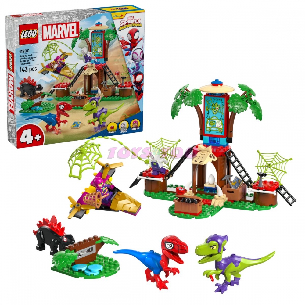 Domek na stromě má 3 plošiny, včetně jedné s velkou obrazovkou zobrazující misi týmu. Nechybí minifigurky Trapster, Ghost-Spider a Trace-E a sestavitelné figurky dinosaurů Spidey-Rexe, Gobby-Raptora a Dino-Spina. Trapsteřino letadlo má 2 vystřelovače. Mezi doplňky najdete velké pavučiny, červené diamanty, truhlu s pokladem, mapu k pokladu, klobásu, vejce, kuřecí stehno, dalekohled a sekeru. Součástí je také barevný obrázkový návod na stavění, který přináší intuitivní pokyny. Jednotlivé sáčky obsahují kostky a velkou začátečnickou kostku, díky kterým se děti můžou hned pustit do stavění.