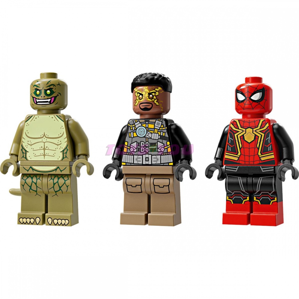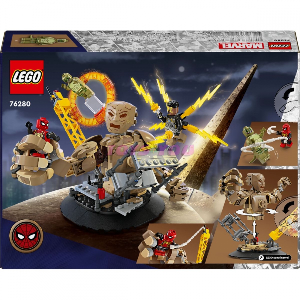 Součástí této kreativní stavebnice z řady LEGO Marvel se Spider-Manem jsou 3 padouchové: Sandman, Electro a Lizard (jedná se o zcela první stavebnici LEGO Marvel s minifigurkou Lizarda). Minifigurky lze umístit hned na několik míst v různých polohách a stavebnice tak nabízí nepřeberné možnosti hraní a vystavování. Sandman je plně pohyblivý a děti ho mohou otáčet a chytat do jeho obřích rukou Spider-Mana, který se nad ním vznáší na svém pavučinovém „laně“. Stavebnici lze kombinovat se sadou Spider-Manova konečná bitva (76261) (prodává se samostatně) pro další herních možnosti. Pro ještě více digitální zábavy je zde zábavná a intuitivní aplikace LEGO Builder, kde mohou stavitelé přibližovat a otáčet modely ve 3D a sledovat postup.