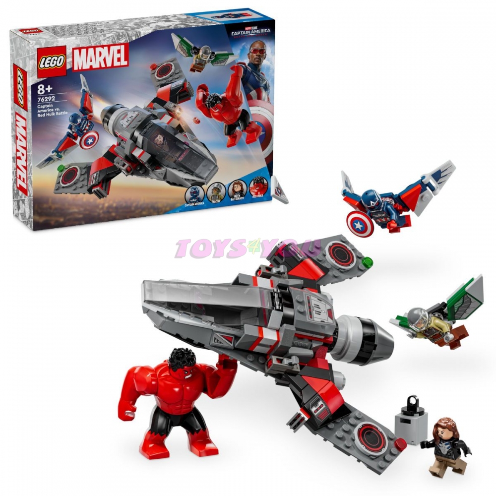 Součástí této stavebnice je působivá řada minifigurek: Kapitán Amerika a Falcon (oba mají zatahovací křídla), Red Hulk a Ruth Bat-Seraph. Nechybí velký otevírací kokpit s prostorem pro minifigurku pilota. Děti tento sestavitelný model snadno uchopí do rukou a mohou s ním létat a útočit pomocí 2 vystřelovačů. Horní část stíhačky lze odejmout a odhalit skrytý úložný prostor s místem na malé dílky a tajemné medaile v zadní části. Model stíhačky se skvěle hodí k nezávislému hraní. Děti mohou přibližovat a otáčet stavebnice ve 3D a sledovat svůj pokrok pomocí zábavné a intuitivní aplikace LEGO Builder.