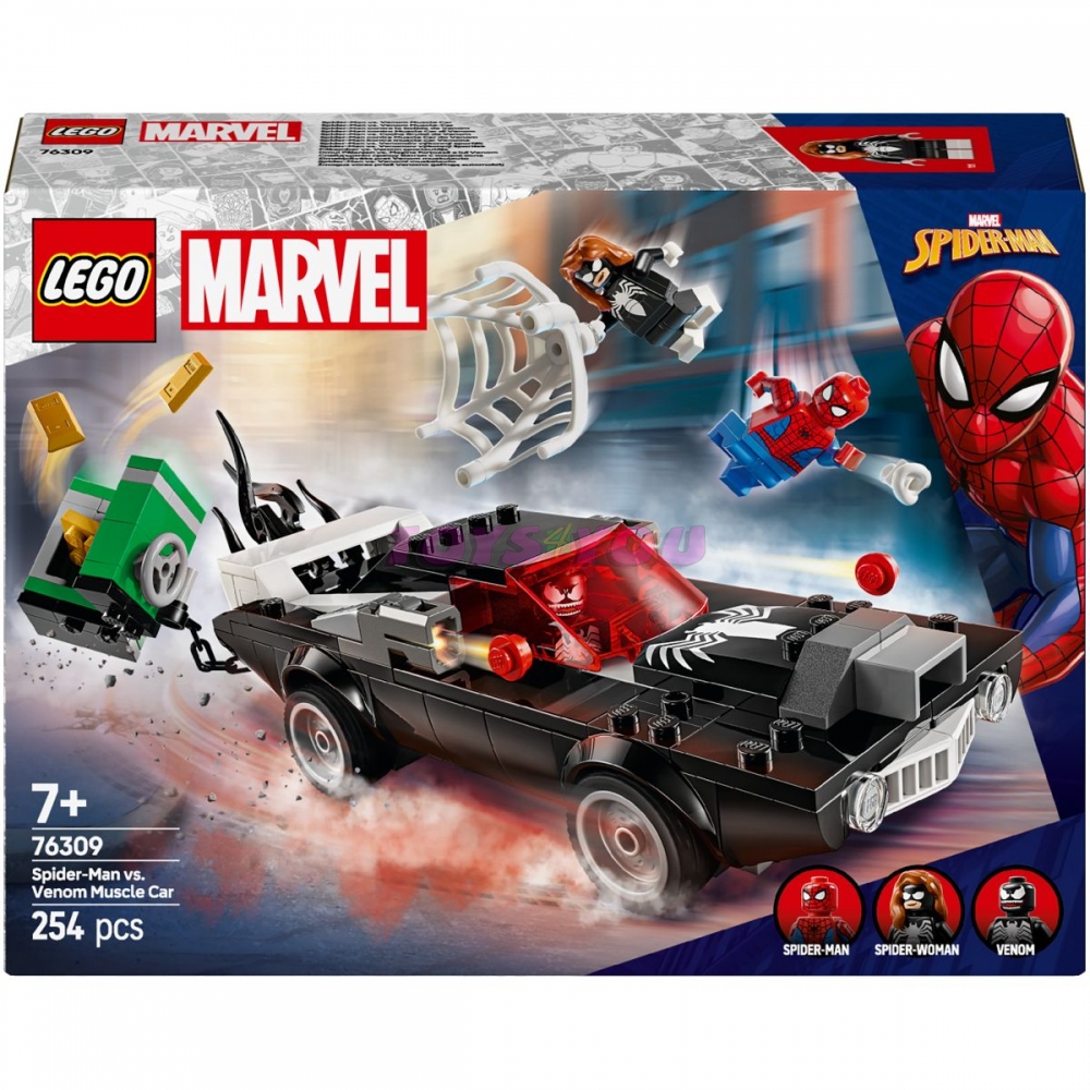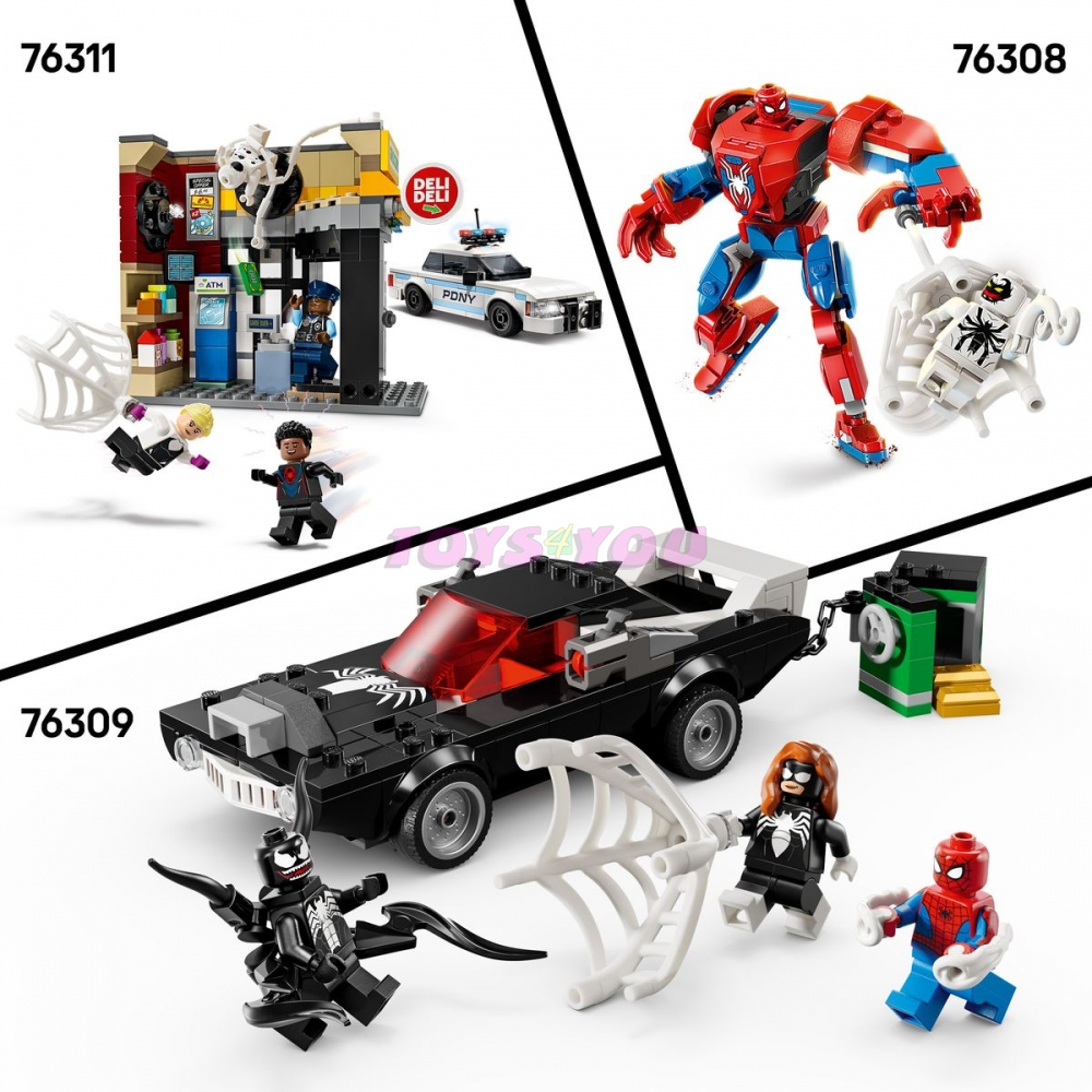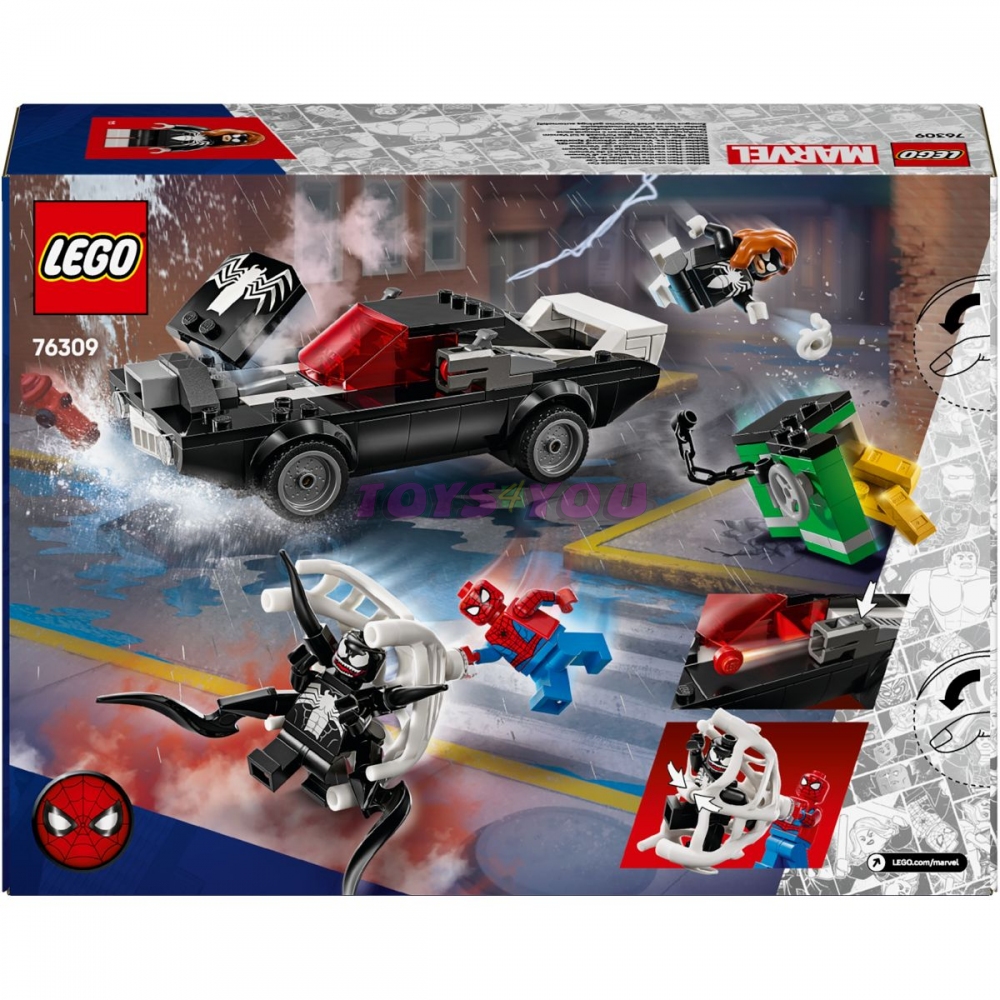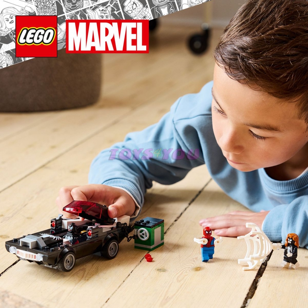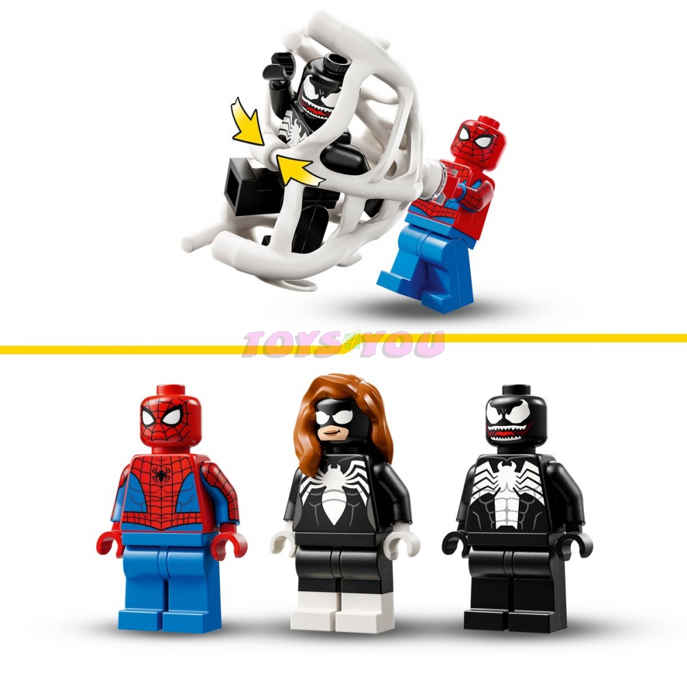 Stavebnice s Venomovým vozidlem obsahuje 3 minifigurky: Spider-Mana s vystřelovačem pavučin, Venoma se 4 chapadly a Spider-Woman (Julii Carpenterovou) s pružnou pavučinou, která je dostatečně velká na to, aby polapila padoucha. Venomizované vozidlo má na každé straně vystřelovač, přístupný motor a otevírací kokpit. Venom může sedět uvnitř auta – stačí odejmout 2 spodní chapadla, která můžete použít k venomizaci auta. Sejf se zlatými cihlami inspiruje k akčnímu hraní na hrdinu a padoucha. Trezor s přihrádkou na zlaté cihly odtáhnete autem. Pro ještě větší digitální zábavu stavitelé můžou přibližovat a otáčet modely ve 3D a sledovat svůj pokrok pomocí zábavné a intuitivní aplikace LEGO Builder.