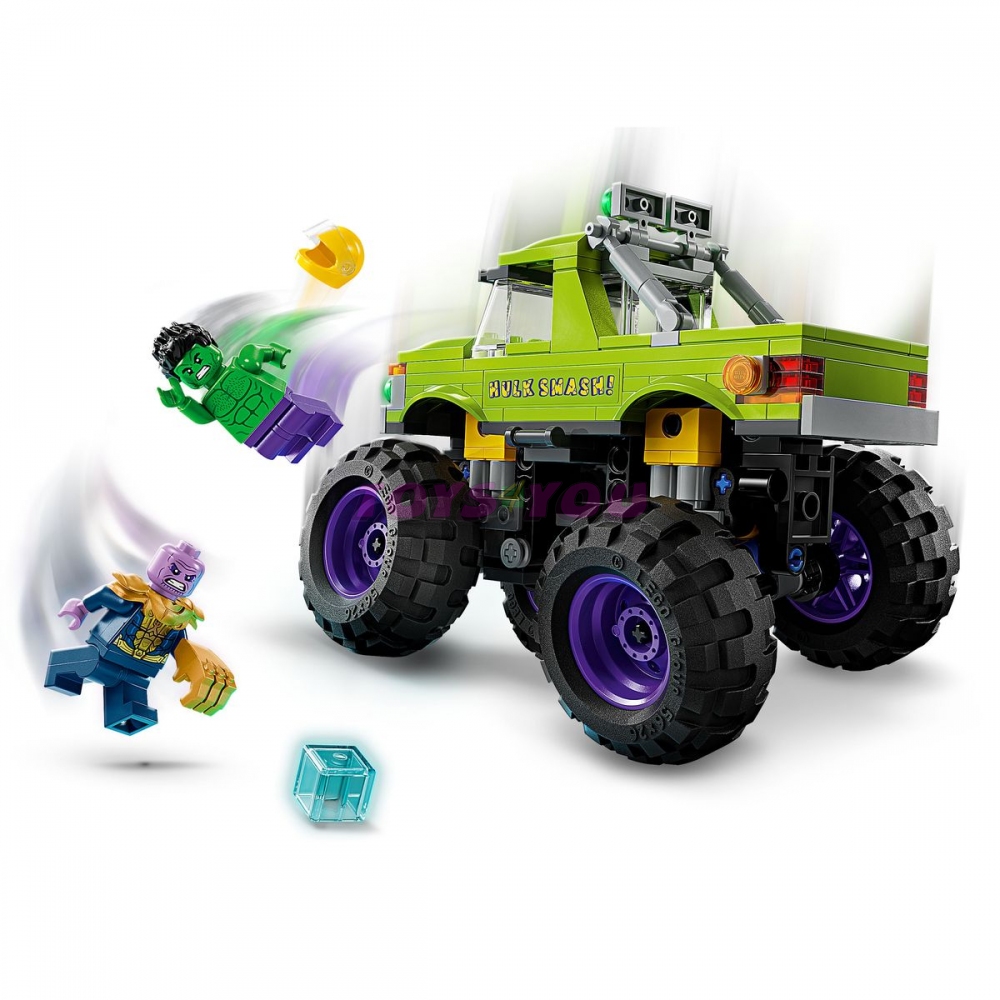 Jste připraveni na Hulkovo zúčtování na kolech!? Otevřete kabinu Hulkova obrovského trucku a posaďte zeleného superhrdinu za volant. Je čas vyhnat Thanose z města! Díky obrovským kolům a odpružení, které tlumí nárazy, tomuto obrovského bouracímu autu nestojí nic v cestě!