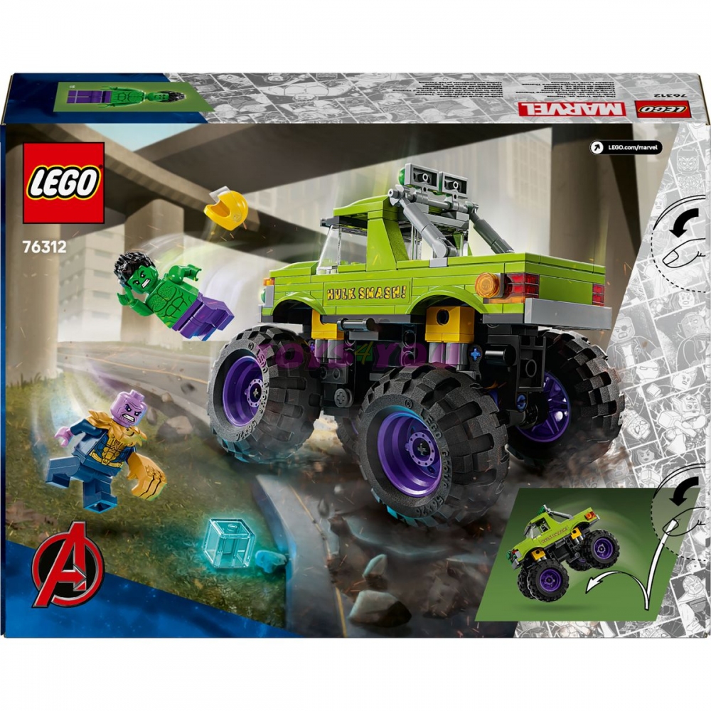 Stavebnice LEGO® | Marvel (76312) Hulkův truck vs. Thanos obsahuje Hulkův obří truck a 2 minifigurky superhrdinů. Tento vysoce kvalitní dárek pro kluky a holky od 7 let představuje skvělý dárek pro děti, které milují filmy Marvel Avengers, velké trucky a dobrodružství se stavebnicemi LEGO. Tento sestavitelný výkonný truck LEGO | Marvel obsahuje minifigurku Hulka s odnímatelnou helmou a minifigurku Thanose s teseraktem a Rukavicí nekonečna. Superhrdinský truck má zvedací kabinu s přístupem na sedadlo řidiče a místem pro minifigurku Hulka. Vnější strana trucku je zelená a zdobí ji nápis „Hulk Smash!“ a Hulkův obličej. Díky velkým otočným kolům, robustní konstrukci a odpružení zvládne tento mega truck i ty nejnáročnější mise. Pro ještě větší digitální zábavu si stavitelé můžou přibližovat a otáčet modely ve 3D a sledovat svůj pokrok pomocí zábavné a intuitivní aplikace LEGO Builder. Model obsahuje 231 dílků.