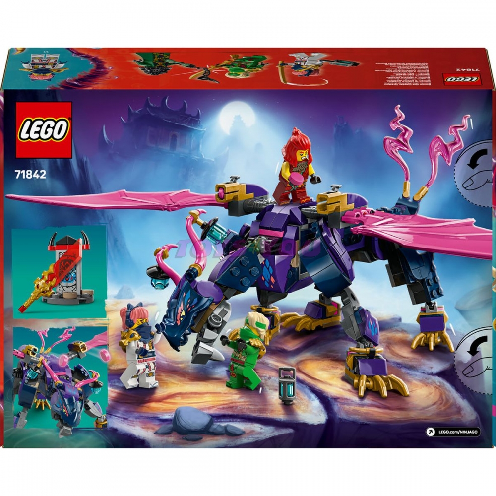 Vydejte se s nindži na odvážnou misi a odhalte tajemství ukryté ve svatyni. Spojte síly se Sorou, Wyldfyre, Lloydem a pánem draků Rontu a dostaňte se přes Zarkta, zlého mistra neštěstí, který střeží svatyni. Zahajte útok z oblak s výkonnými vystřelovači Rontu nebo ze země s parádními nindžovskými zbraněmi. Nindžové musí zvítězit a jejich osud je jen na vás! Product Headline Stavebnice LEGO® NINJAGO® s drakem a 4 minifigurkami Product Oneliner Děti si se stavebnicí LEGO® NINJAGO® Rontu – Pán draků se 4 minifigurkami připomenou akční scény z 3. řady seriálu NINJAGO® Dračí povstání. Product Shopper Se stavebnicí LEGO® NINJAGO® (71842) Rontu – Pán draků si fanoušci nindžů od 7 let připomenou akční scény z 3. řady televizního seriálu NINJAGO Dračí povstání. Tato stavebnice pro děti obsahuje model draka s pohyblivým ocasem, nohama, křídly, hlavou a čelistí, 2 pozicemi na zádech pro umístění minifigurky a vystřelovačem pod každým křídlem. Tato stavebnice LEGO obsahuje 4 minifigurky NINJAGO: Nindža válečníky Lloyda, Soru a Wyldfyre s nindžovskými zbraněmi a mistra neštěstí Zarkta, se kterými si děti přehrají velkolepé bitvy dobra proti zlu. Součástí je také miniaturní svatyně z kostek s tajným vzkazem, který Lloyd odhalí pomocí své průsvitné odhalující čepele. Stavebnice a sestavitelné akční hračky z řady LEGO NINJAGO (prodávají se samostatně) obsahují robotické obleky, vozidla a chrámy a fanoušci si s nimi užijí hodiny akčního hraní s nindži. Aplikace LEGO Builder vám a vašemu dítěti ukáže snadnou a intuitivní cestu stavitelským dobrodružstvím. Product Bullets • Hračka LEGO® NINJAGO® s drakem pro děti – Se stavebnicí Rontu – Pán draků si kluci a holky od 7 let připomenou scény z 3. řady televizního seriálu NINJAGO Dračí povstání • Pohyblivá figurka draka – Tento velký drak má pohyblivý ocas, nohy, křídla, hlavu a čelist, na zádech 2 místa pro minifigurky a pod oběma křídly najdete vystřelovač • Miniaturní svatyně – Stavebnice pro hraní rolí obsahuje malou svatyni z kostek střeženou Zarktem s tajnou zprávu, kterou může Lloyd rozluštit pomocí své průsvitné odhalující čepele • 4 minifigurky NINJAGO® – Součástí této stavebnice LEGO® jsou nindža válečníci Sora, Wyldfyre, Lloyd a zlotřilý Zarkt s nindžovskými zbraněmi, se kterými si děti můžou hrát na bitvy dobra proti zlu • Narozeninový dárek s nindžovskou tematikou pro děti – Tato stavebnice LEGO® představuje zábavný stavitelský a herní zážitek a poslouží jako skvělý dárek k narozeninám pro děti od 7 let, které milují akci s nindži • Zábavné stavění – Proveďte děti na jejich příštím stavitelském dobrodružství intuitivní aplikací s návodem LEGO® Builder. Umožní jim ukládat si stavebnice, sledovat postup a přibližovat a otáčet modely ve 3D, zatímco na nich pracují • Svět stavebnic LEGO® NINJAGO® – Tato rozsáhlá kolekce nindžovských stavebnic (prodávají se samostatně) dětem umožní ponořit se do světa fantazie a kreativně si hrát s nindžovskými hrdiny • Rozměry – Tato stavebnice LEGO® NINJAGO® se skládá z 381 dílků a figurka Rontu – Pána draků měří přes 13 cm na výšku. Věk 7+. Kostek 381.