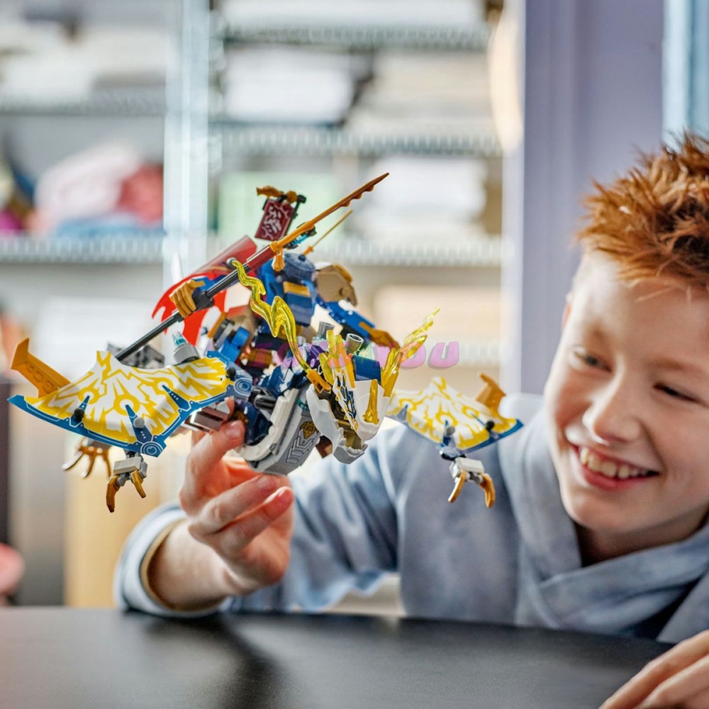 Vůdce Zakázané pětky, Rox, a Přízračný dračí bojovník napadli Sloučené říše. Spojte se s Arinem a Rogue a bojujte! Připevněte Rogueova robota na záda vůbec prvního robotického draka NINJAGO® a vytvořte úžasného robotického dračího jezdce, se kterým se vrhnete do bitvy. S takovými hrdiny a sbírkou zbraní zaručeně zvítězíte nad zlem!