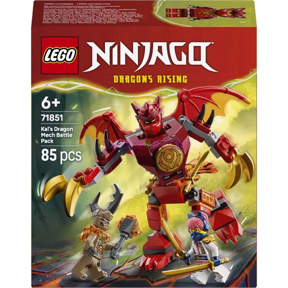 Stavebnice LEGO® NINJAGO® s robotem a 3 minifigurkami. Kluci, holky a všichni fanoušci seriálu NINJAGO® Dračí povstání od 6 let si užijí hodiny kreativní zábavy se stavebnicí LEGO® NINJAGO Kaiův bojový balíček s dračím oblekem (71851). Tato stavebnice obsahuje dračí robotický oblek s pohyblivýma nohama, velkými křídly a rukama s drápy. Horní část těla lze otáčet o 360 stupňů a do kokpitu lze umístit minifigurku. Tato parádní nindžovská hračka obsahuje také 3 minifigurky: Kaie vyzbrojeného 2 meči, Soru se 2 meči a zemské monstrum s drápy, díky kterým si děti užijí hodiny dobrodružství při přehrávání scén ze 4. řady seriálu NINJAGO Dračí povstání. Řada stavebnic a dobrodružných hraček LEGO NINJAGO pro děti obsahuje propracované robotické obleky, draky a chrámy, se kterými se fanoušci vydají na úžasná akční dobrodružství s nindži. Aplikace LEGO Builder dodává dětem při stavění jistotu – můžou přibližovat a otáčet modely ve 3D a sledovat postup pomocí srozumitelného digitálního návodu. Stavebnice obsahuje 85 dílků. Věk 6+.