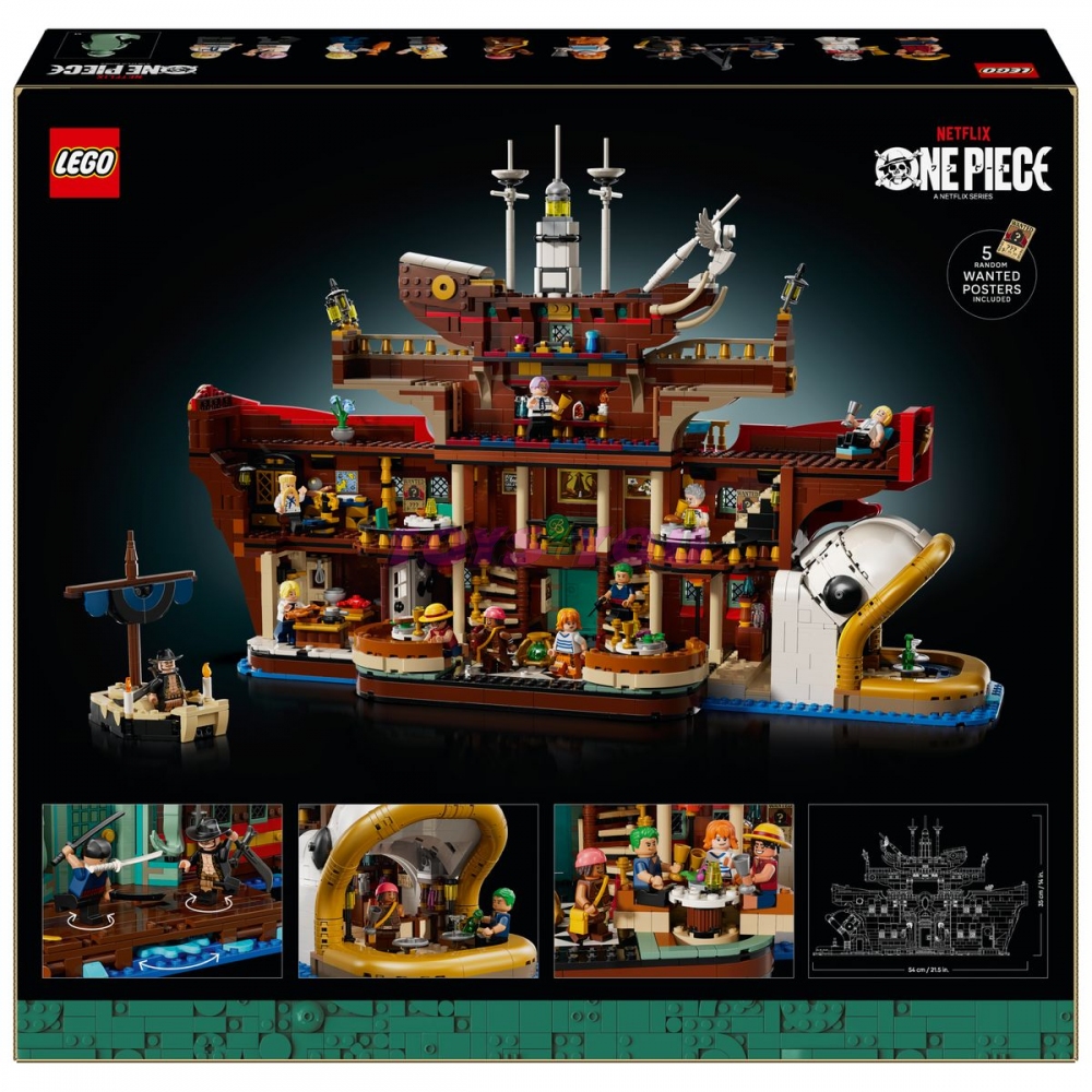 Tento impozantní výstavní kousek ve tvaru lodi obsahuje řadu přístupných místností, včetně kuchyně a jídelny, Zeffovy kajuty a místnosti s pokladem. Připomeňte si klasické scény s 10 minifigurkami LEGO: Luffym, Zorem, Nami, Usoppem, Sanjim, Zeffem, Garpem, Helmeppem, Kobym a Mihawkem. Stavebnice obsahuje také řadu autentických doplňků, včetně 5 plakátů s hledanými osobami. Aplikace LEGO Builder umožňuje uživatelům přibližovat a otáčet modely ve 3D a sledovat postup stavění.