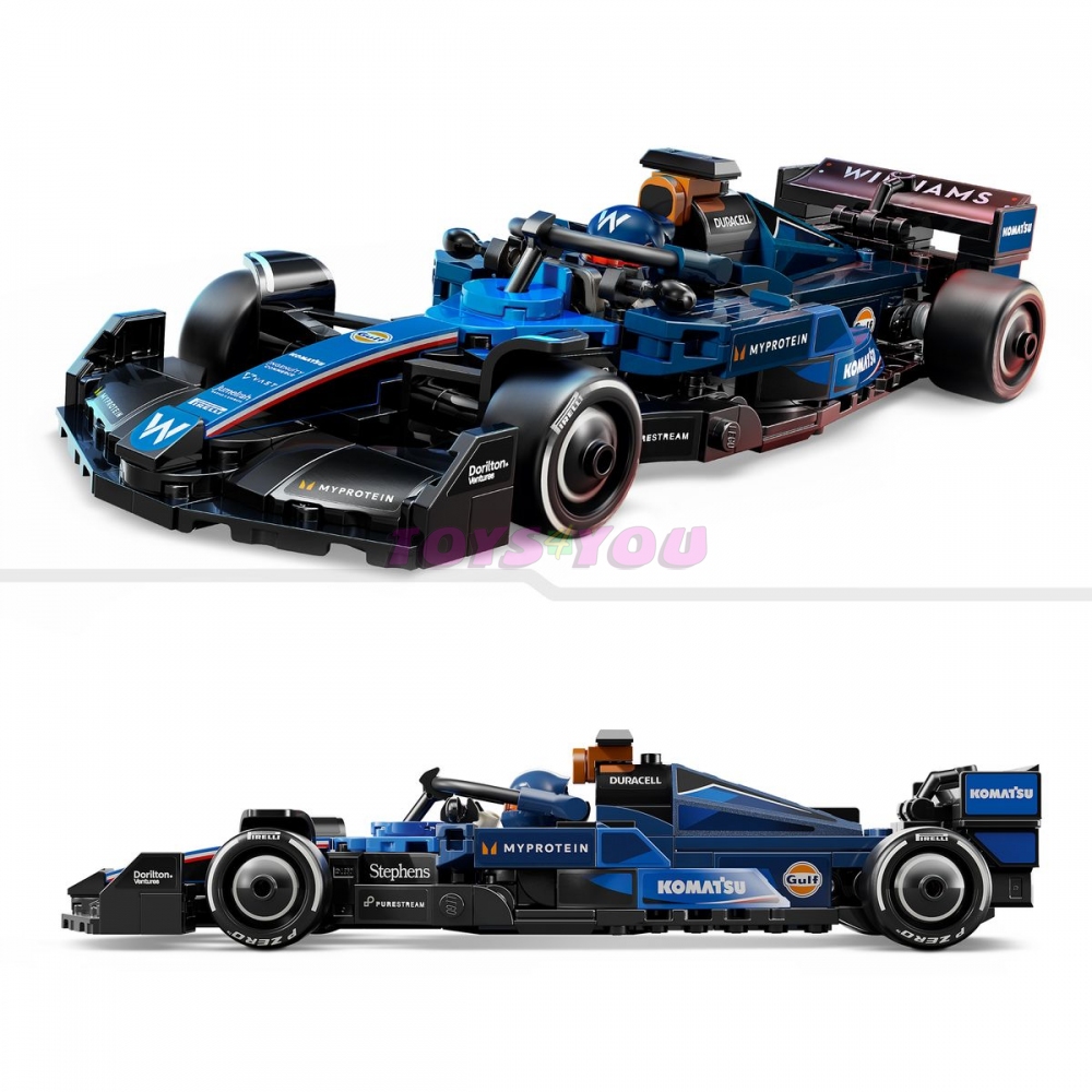 Tento model vozu F1 má kokpit, který lze otevřít zvednutím svatozáře, zadní křídlo, rovnoběžníkovou nápravu, polepy sponzorů a širší zadní pneumatiky s nápisem „Pirelli“. Součástí sestavitelného auta F1 je také minifigurka jezdce v outfitu Williams Racing s okřídlenou helmou, kterou můžete umístit do kokpitu.