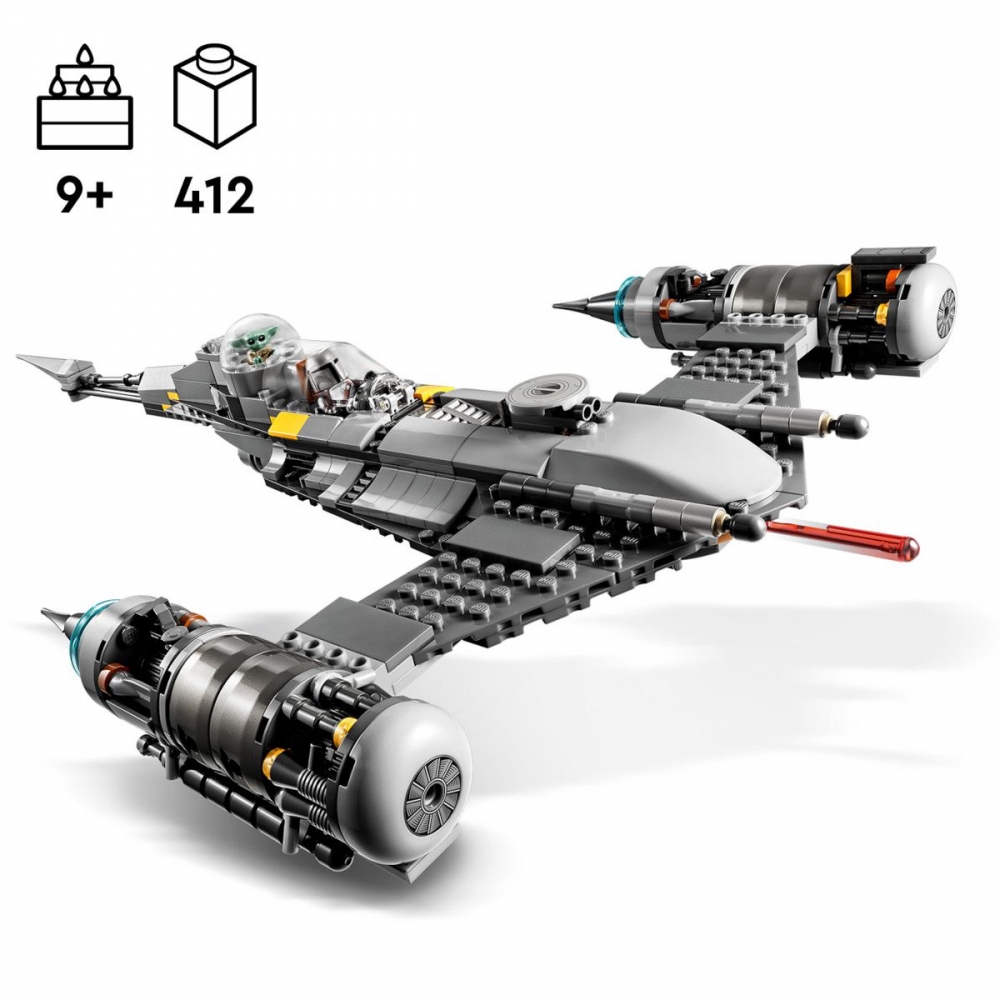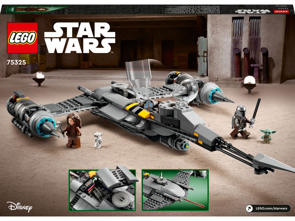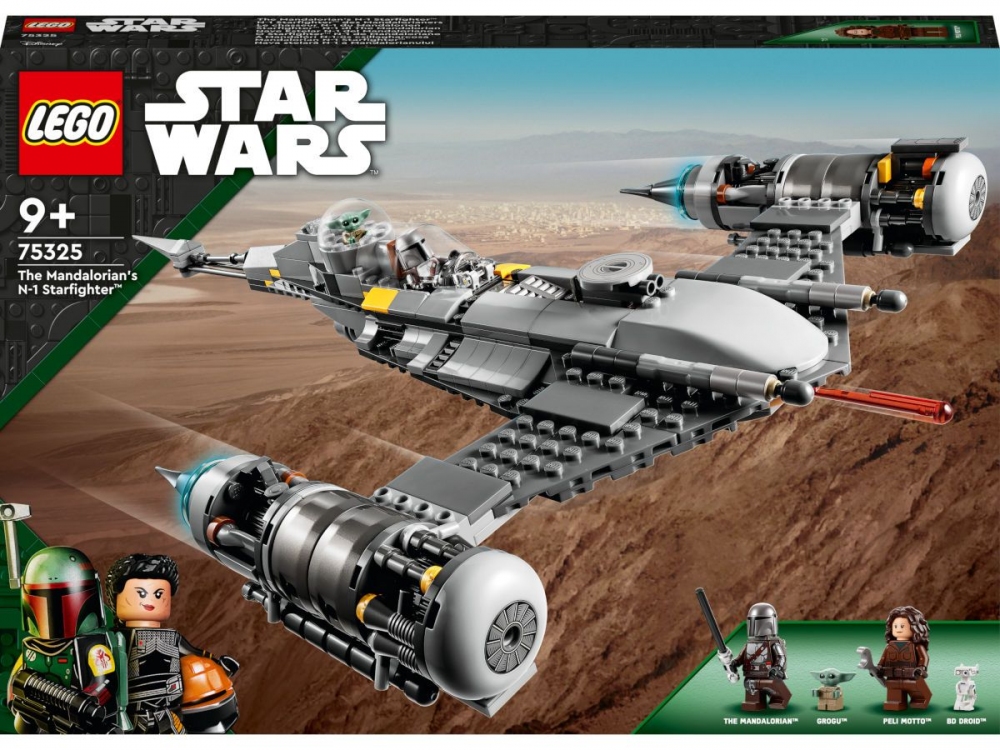 Příběhy na planetě Tatooine ze seriálu Star Wars: The Book of Boba Fett ožijí malým stavitelům pod rukama díky modelu LEGO® Mandalorianova stíhačky N-1 (75325). Nabízí kokpit pro minifigurku, prostor pro Grogua, nákladní prostor, pružinový vystřelovač a realistické detaily. Tato stavebnice nabízí minifigurky LEGO Mandaloriana a Peli Motto, a k tomu navíc figurky LEGO Grogua (kterému se láskyplně přezdívá „Dítě“) a droida BD pro kreativní hraní. Součástí stavebnice je podrobný, ilustrovaný návod. Model stíhačky N-1 měří přes 7 cm na výšku, 42 cm na délku a 29 cm na šířku. Počet kostek: 412. Věk: 9+