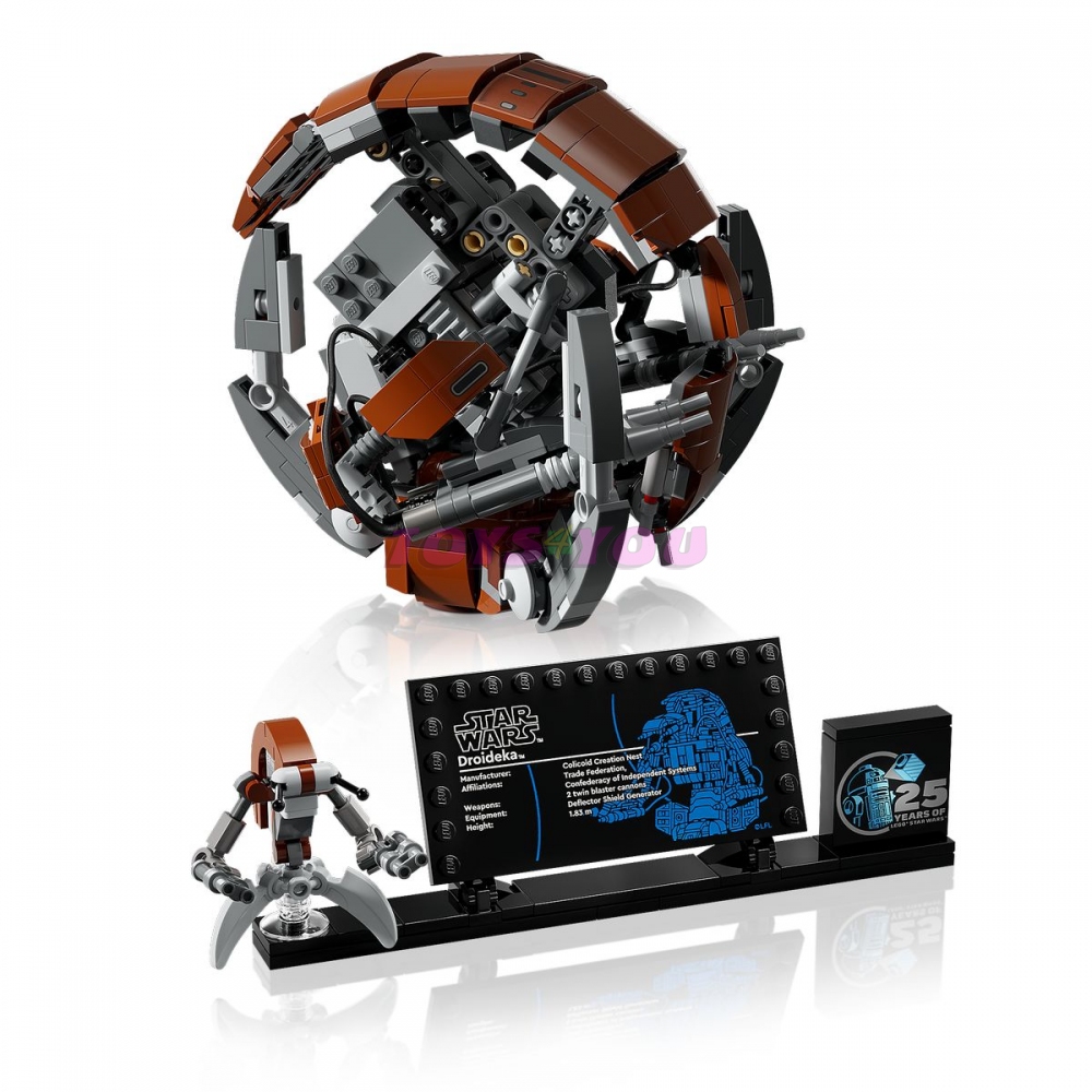 Sestavitelná figurka LEGO® droida Droideky – Vytvořte zábavný výstavní kousek s tímto sběratelským modelem ničivého droida Droideky z filmu Star Wars: Skrytá hrozba a Star Wars: Klonové války