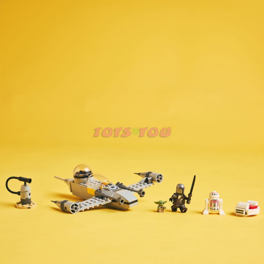 Tato stavebnice stíhačky N-1 obsahuje 3 postavy LEGO Star Wars: Mandaloriana s temným mečem a jetpackem, Grogua s vznášejícím se kočárkem a R5-D4. Posaďte Mandaloriana do otevíracího kokpitu stíhačky N-1 a Grogua do prostoru pro cestující vzadu.