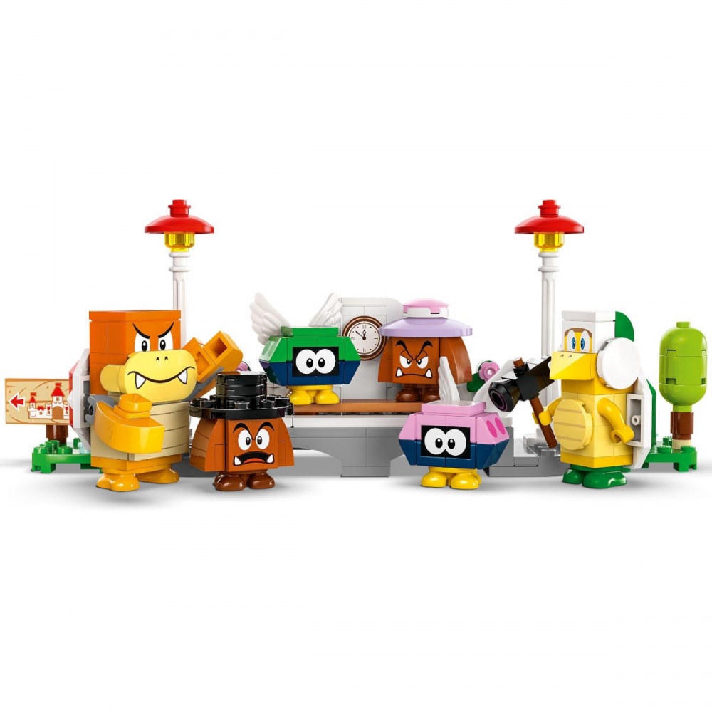 Přidejte figurku LEGO® Mario™, LEGO® Luigi™ nebo LEGO® Peach™ (ze setů 71439, 71440 nebo 71441 – prodávají se samostatně) a užijte si s nimi porci interaktivního hraní. Naskočte s nimi do drezíny a pronásledujte spolu vlak, ovládejte otáčecí plošinu na lokomotivě a aktivujte pružinový vystřelovač dělového vagónu. Až všechny nepřátele porazíte, uslyšíte zvuk klaksonu, když budete v Bowserově rychlíku přijíždět na stanici.