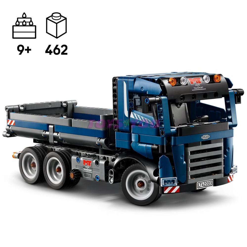 Rozměry – Stavebnice se skládá z 462 dílků a Nákladní sklápěč měří přes 14 cm na výšku, 28 cm na délku a 11 cm na šířku. Věk: 9+. Počet kostek: 462.