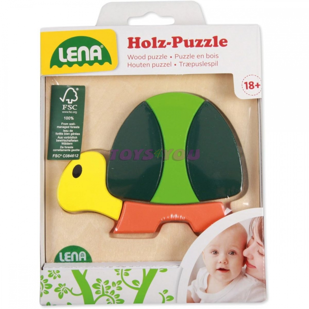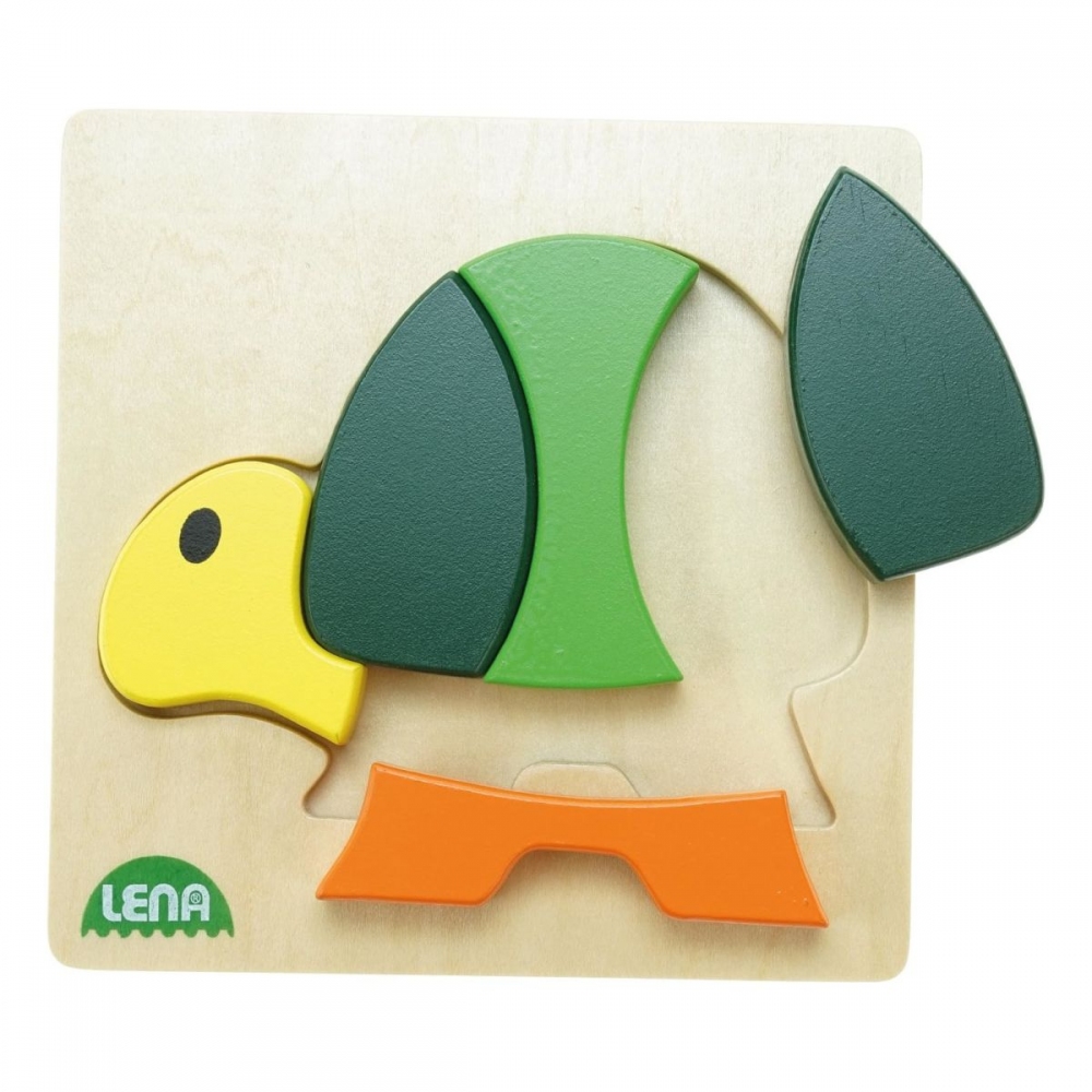 LEN32063 - Dřevěné puzzle - želva Dřevěné barevné puzzle s motivem zvířátek, je vyrobeno pro nejmenší z nás :-). Skládá se z barevného zvířátka, rozděleného do několika části a předem vytvořené drážky v podložce, která zlepšuje usazení jednotlivých částí. Věk: +1 let