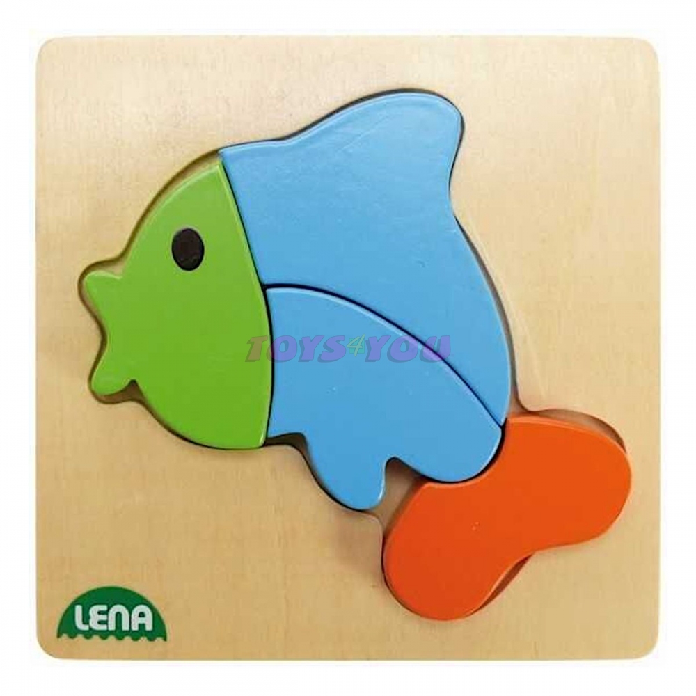 LEN32068 - Dřevěné puzzle - ryba Dřevěné barevné puzzle s motivem zvířátek, je vyrobeno pro nejmenší z nás :-). Skládá se z barevného zvířátka, rozděleného do několika části a předem vytvořené drážky v podložce, která zlepšuje usazení jednotlivých částí. Věk: +1let