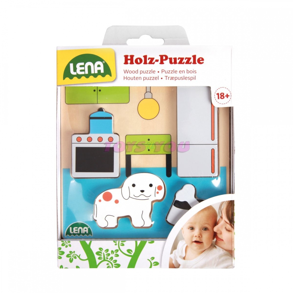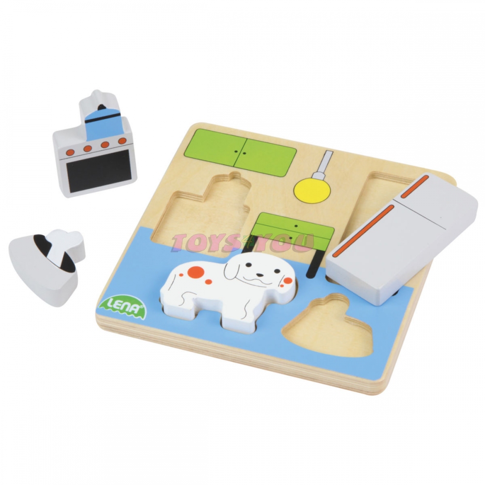 Dřevěné barevné puzzle kuchyň, je vyrobeno pro nejmenší děti. Rozděleno do několika části s předem vytvořenými drážkami v podložce, která zlepšují usazení jednotlivých částí dílků. Velikost: 14x2x18 cm. Věk: 18měs.+