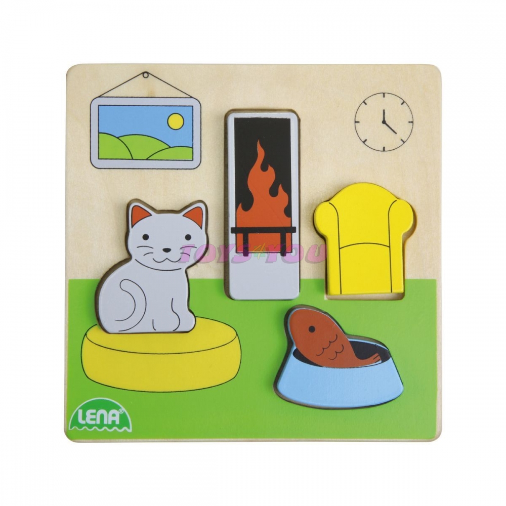 Dřevěné barevné puzzle obývací pokoj, je vyrobeno pro nejmenší děti. Rozděleno do několika části s předem vytvořenými drážkami v podložce, která zlepšují usazení jednotlivých částí dílků. Velikost: 14x2x18 cm. Věk: 18měs.+