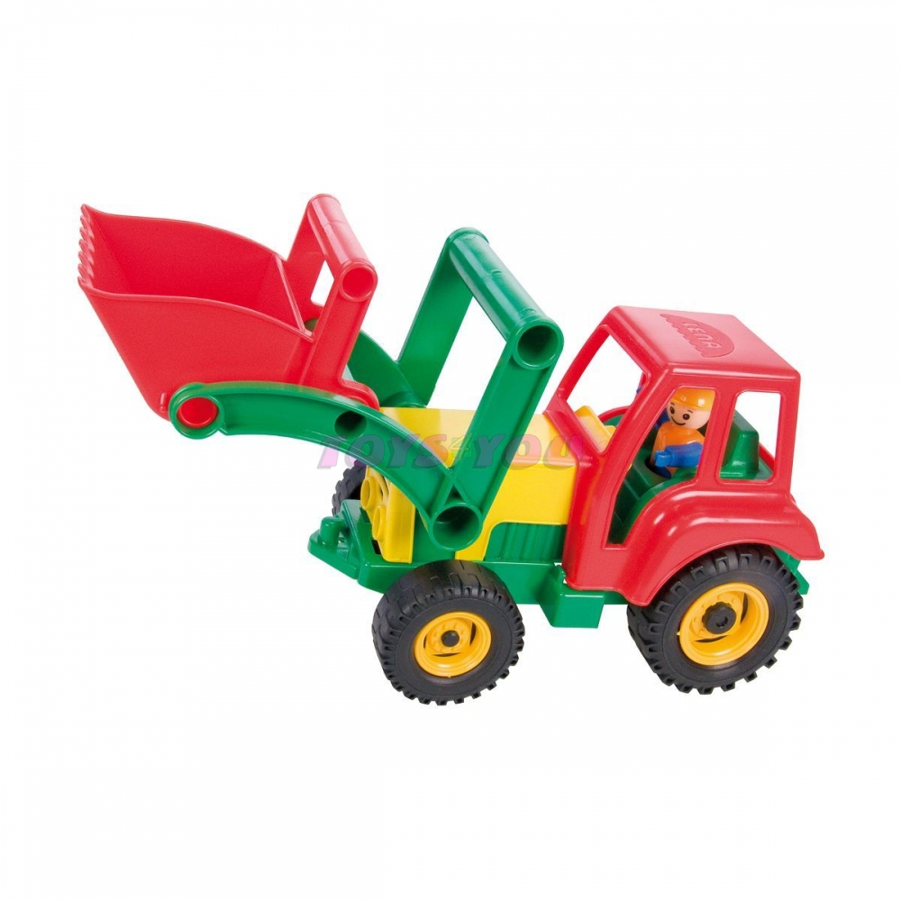 Aktivní traktor se lžící z kvalitního plastu a velmi pevnou stavbou. Plně mechanicky funkční. Obsahuje odklopitelnou kabinu s aktivním panáčkem. Velikost: 35x18x15 cm. Věk: 2+