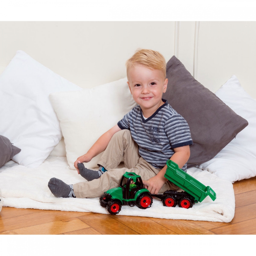 Truckies traktor z kvalitního plastu a velmi pevnou stavbou. Plně mechanicky funkční. Obsahuje odklopitelnou kabinu s aktivním panáčkem a přípojnou vlečku. Rozměr: 38x10x14 cm. Věk: 2+