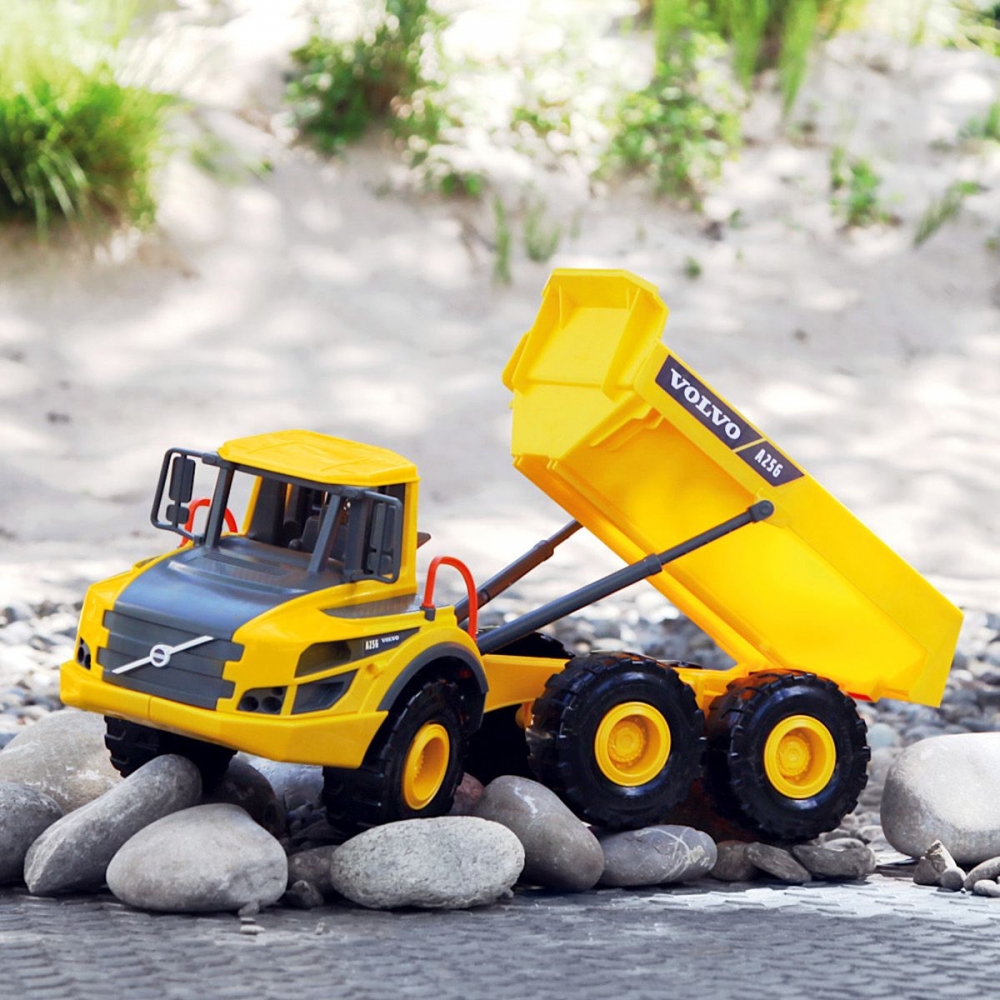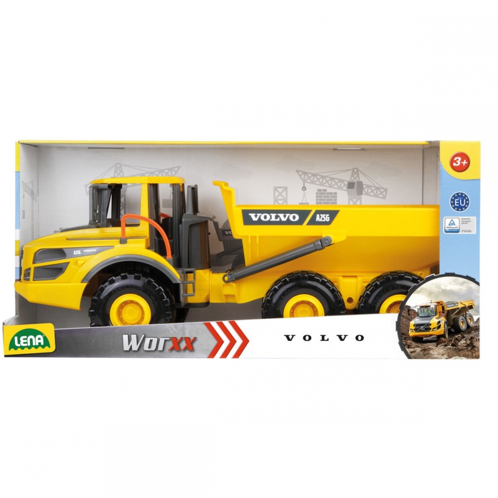 Volvo A25G nákladní auto Kód: 4616 Parametry Výrobce: LENA Výroba: ČR Rozměr: 54x19x26 cm 5 mm pozinkované trojité nápravy s off road odpružením kol. Snadné otáčení díky otočnému a sklopnému kloubovému řízení. Doporučený věk: 3+