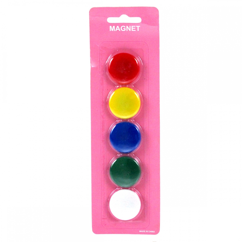 Pět kusů barevných magnetů 30 mm v modré, zelené, bílé, červené a žluté barvě Magnety dobře přilnou na jakýkoliv kovový povrch Vhodný pro magnetické nástěnky, ledničky