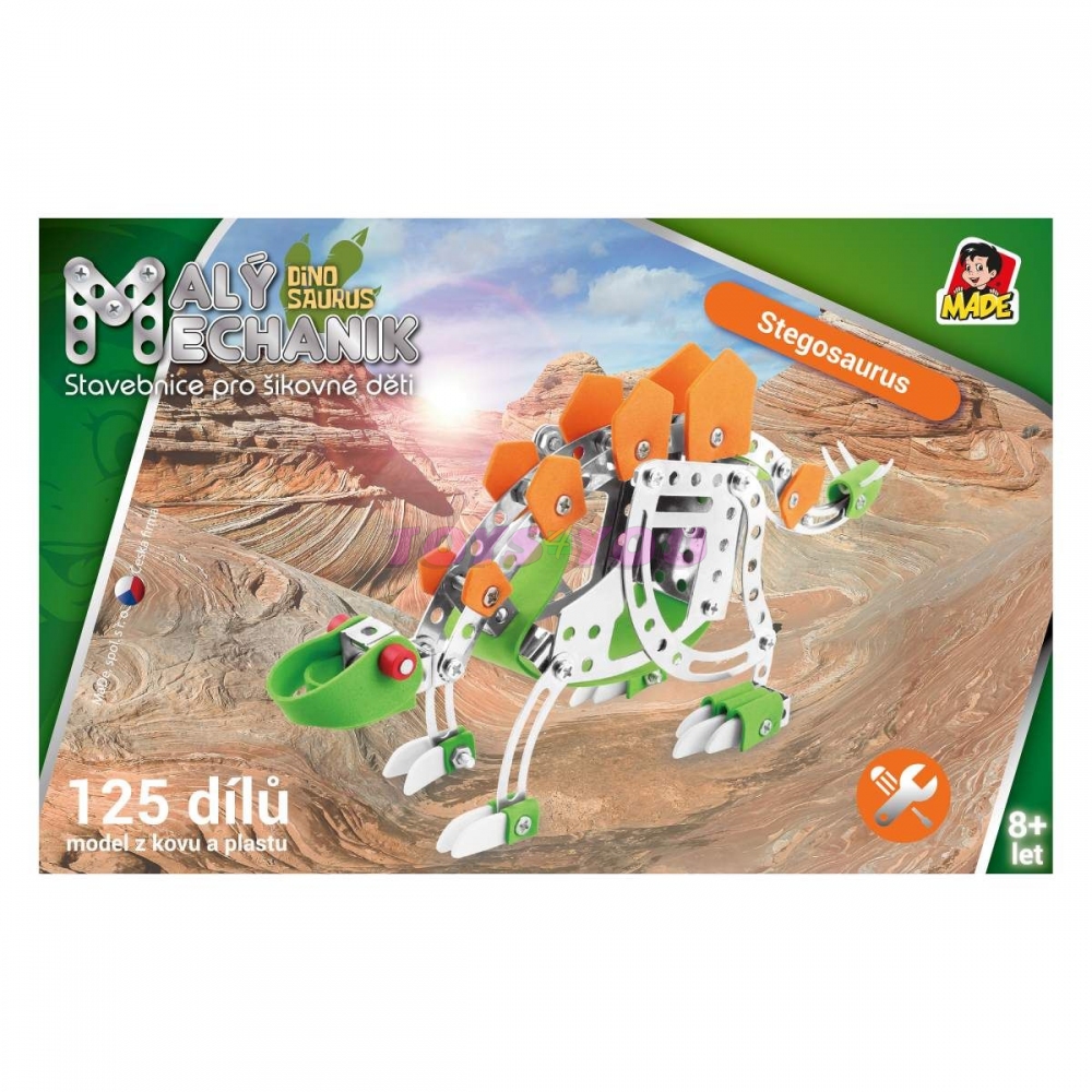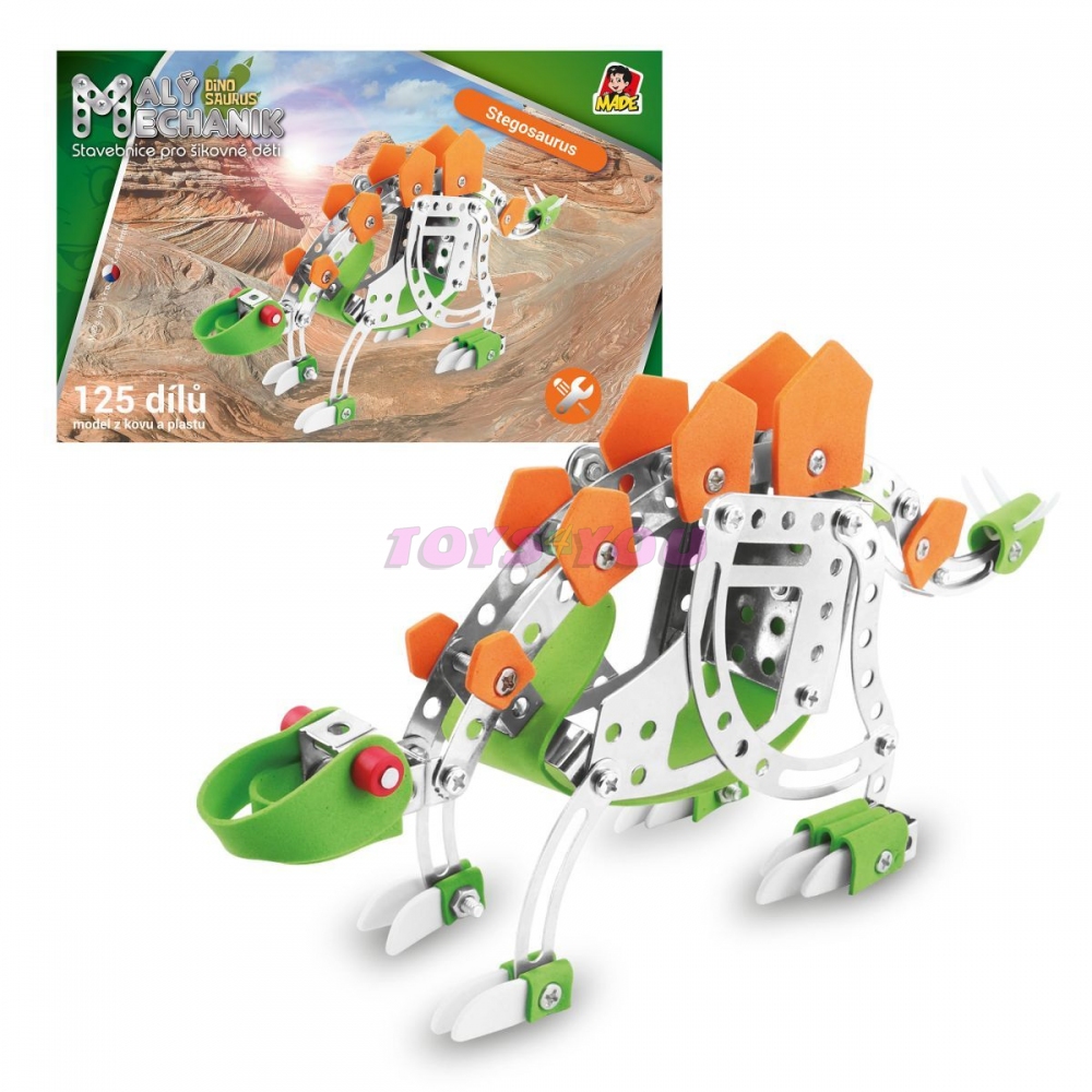 Malý mechanik - stegosaurus. Dětská stavebnice Malý mechanik obsahuje kovové díly a plastové doplňky, spojuje se pomocí šroubků a matiček. 125 dílků. Český box v grafickém designu řady Malý mechanik.Rozměr: 25 x 8 x 13,5 cmDoporučený věk: 6 +