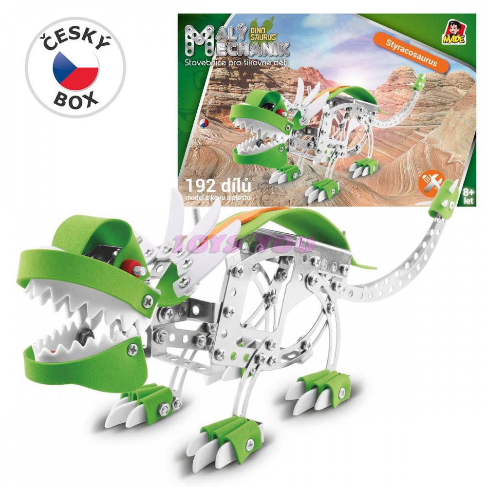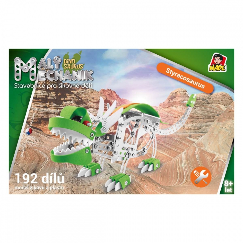 Malý mechanik - dinosaurus. Dětská stavebnice Malý mechanik obsahuje kovové díly a plastové doplňky, spojuje se pomocí šroubků a matiček. 192 dílků. Český box v grafickém designu řady Malý mechanik.Rozměr produktu: 35 x 8,5 x 11 cmDoporučený věk: 6 +