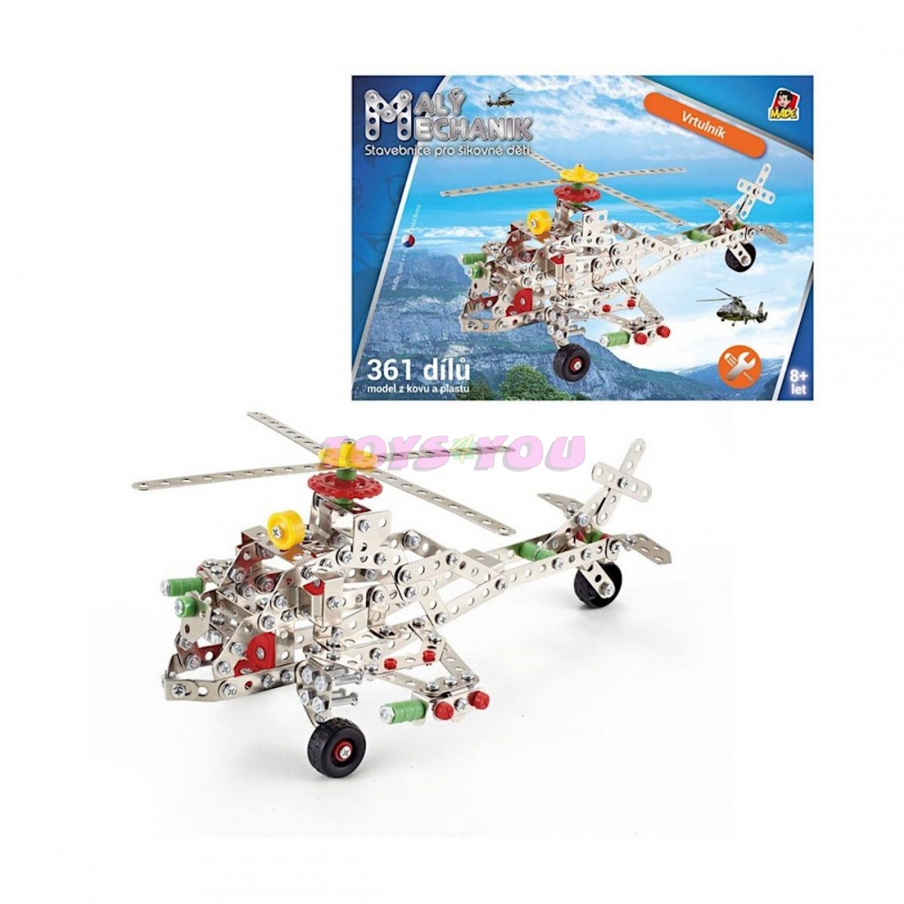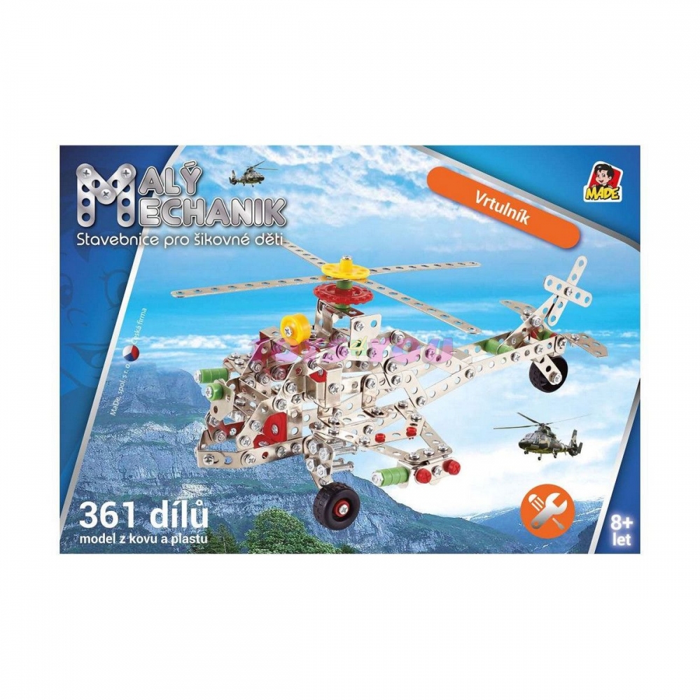 Malý mechanik - vrtulník, 361 dílků, 21 x 27 x 13 cm. Stavebnice Malý mechanik je skvělým vstupem do světa techniky. Rozvijí dětskou motoriku, kreativitu, manuální zručnost a zároveň představivost. Učí děti trpělivosti a samostatnosti při řešení problému. Odměnou bude vlastnoručně sestavený výrobek, se kterým si dítě užije další spoustu zábavy. Dětská stavebnice Malý mechanik obsahuje kovové díly a plastové doplňky, spojuje se pomocí šroubků a matiček. Balení obsahuje celkem 361 dílků. Součástí každé sady je šroubovák a klíč pro povolování a utahování. Český box v grafickém designu řady Malý mechanik.Malý mechanik - vrtulník, 361 dílků.Rozměr: 21 x 27 x 13 cm.Doporučený věk: 8 +Materiál hračky je plast/kov.