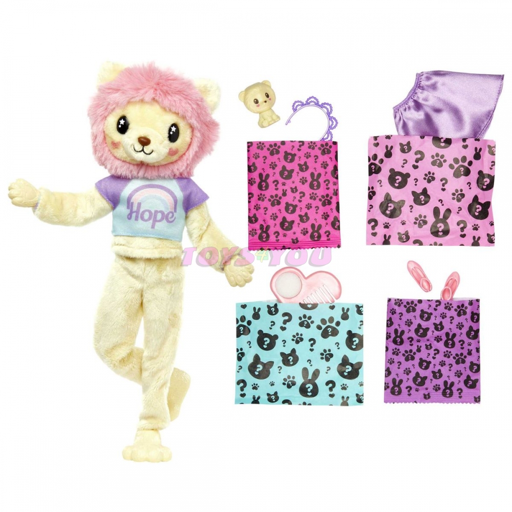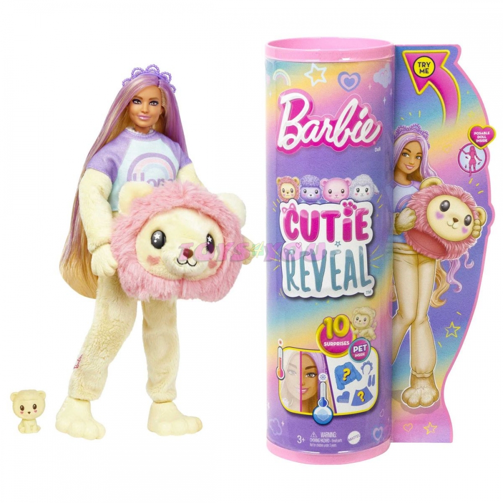 Panenky Barbie® Cutie Reveal™ Cozy Cute Tees™ nabízejí ten nejroztomilejší zážitek z rozbalování s 10 překvapeními! Objevte stydlivého lva v našitém tričku s nápisem „Naděje“. Sundejte plyšový kostým a odhalte pohyblivou panenku Barbie® s dlouhými barevnými vlasy. Buďte útulnější s dalšími překvapeními, které se otevírají jako čelenka, saténová sukně a odpovídající mini zvířátko. Otočte plyšový top za fleecovou bundu a přehoďte hlavu kostýmu do pelíšku pro domácí mazlíčky. Ledově studená voda dodává ještě více roztomilosti s proměnami barev na vlasech panenky a mini mazlíčka - teplá voda je promění zpět pro opakovanou zábavu! Děti budou milovat objevování všech roztomilých překvapení v této útulné roztomilé sérii Barbie® Cutie Reveal™. Obsahuje panenku ve zvířecím kostýmu a 10 překvapení. Každá panenka se prodává samostatně, podle dostupnosti. Panenky nemohou stát samy. Barvy a dekorace se mohou lišit. S 10 překvapeními v 1 balení, panenky Barbie® Cutie Reveal™ Cozy Cute Tees™ Series poskytují ten nejroztomilejší zážitek z rozbalování s plyšovými zvířecími kamarády, módou a proměňující zábavou! Kterou panenku odhalíte? Rozbalte a najděte rozkošného plyšového žlutého lva v barevném tričku s inspirativním poselstvím „Naděje“ a uvnitř ukrývající panenku Barbie®! Zvedněte hlavu kostýmu a odhalte pohyblivou panenku Barbie® s dlouhými blond vlasy s fialovými pruhy, 9 pohyblivými klouby a třpytivými detaily tváře! Otevřete 4 sáčky s překvapením a najděte módu a doplňky – jako je saténová sukně, čelenka Barbie®, pár bot, hřeben s houbou a rozkošný mini lvíček, který se k ní hodí! Děti se mohou oblékat a upravovat Cutie Barbie® tak, že obrátí vršek kostýmu a najdou super měkkou fleecovou bundu s pastelovým duhovým potiskem. Hlava kostýmu se promění v postel i pro malého mazlíčka! Použijte ledově studenou vodu k přeměně vlasů panenky Barbie® pomocí barevného pruhu a k „otevření a zavření“ očí mini mazlíčka. -- vyměňte zpět teplou vodou. Opakujte znovu a znovu! Panenky Barbie® Cutie Reveal™ řady Cozy Cute Tees™ jsou skvělým dárkem pro děti od 3 do 7 let, zvláště pro ty, které milují objevování roztomilých překvapení!