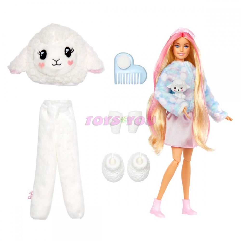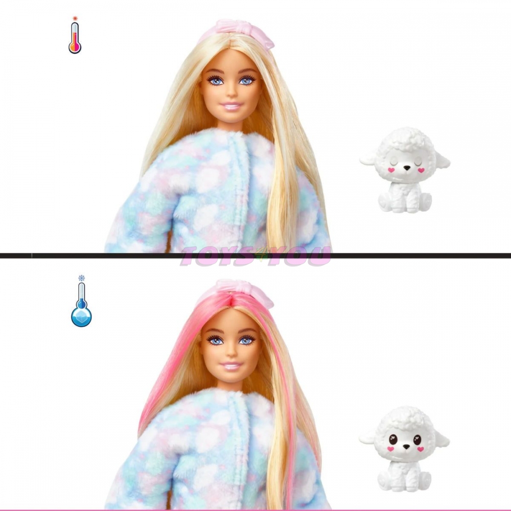 Panenky Barbie® Cutie Reveal™ Cozy Cute Tees™ nabízejí ten nejroztomilejší zážitek z rozbalování s 10 překvapeními! Objevte sladkého beránka v našitém tričku s nápisem „Dream“. Sundejte plyšový kostým a odhalte pohyblivou panenku Barbie® s dlouhými barevnými vlasy. Buďte útulnější s dalšími překvapeními, které se otevírají jako čelenka, saténová sukně a odpovídající mini zvířátko. Otočte plyšový top za fleecovou bundu a přehoďte hlavu kostýmu do pelíšku pro domácí mazlíčky. Ledově studená voda dodává ještě více roztomilosti s proměnami barev na vlasech panenky a mini mazlíčka - teplá voda je promění zpět pro opakovanou zábavu! Děti budou milovat objevování všech roztomilých překvapení v této útulné roztomilé sérii Barbie® Cutie Reveal™. Obsahuje panenku ve zvířecím kostýmu a 10 překvapení. Každá panenka se prodává samostatně, podle dostupnosti. Panenka nemůže stát sama. Barvy a dekorace se mohou lišit. S 10 překvapeními v 1 balení, panenky Barbie® Cutie Reveal™ Cozy Cute Tees™ Series poskytují ten nejroztomilejší zážitek z rozbalování s plyšovými zvířecími kamarády, módou a proměňující zábavou! Kterou panenku odhalíte? Rozbalte a najděte sladkého plyšového beránka v barevném tričku s inspirativním poselstvím „Dream“ a uvnitř skrývající panenku Barbie®! Zvedněte hlavu kostýmu a odhalte pohyblivou panenku Barbie® s dlouhými blond vlasy s růžovými pruhy, 9 pohyblivými klouby a třpytivými detaily ve tvaru obličeje! Otevřete 4 sáčky s překvapením a najděte módu a doplňky – jako je saténová sukně, čelenka Barbie®, pár bot, hřeben s houbou a rozkošné ladící mini jehně! Děti mohou oblékat a upravovat panenku Cutie Barbie® tak, že obrátí vršek kostýmu a najdou super měkkou fleecovou bundu s potiskem mraků v barvě cukroví. Hlava kostýmu se promění v postel i pro malého mazlíčka! Použijte ledově studenou vodu k přeměně vlasů panenky Barbie® pomocí barevného pruhu a k „otevření“ a „zavření“ očí mini mazlíčka – změňte je zpět teplou vodou. Opakujte znovu a znovu! Panenky Barbie® Cutie Reveal™ řady Cozy Cute Tees™ jsou skvělým dárkem pro děti od 3 do 7 let, zvláště pro ty, které milují objevování roztomilých překvapení!